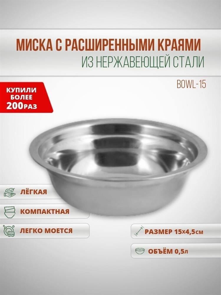 Миска из нержавеющей стали № 410 с расширенными краями Толщина — 0,3 мм Одинарное дно Внутри и снаружи — зеркальная полировка Упаковка: стикер/пакет Не рекомендуется мыть в посудомоечной машине. Подходит для индукции. диаметр 15 см * 4,5 см (высота) литраж 0,5 л