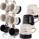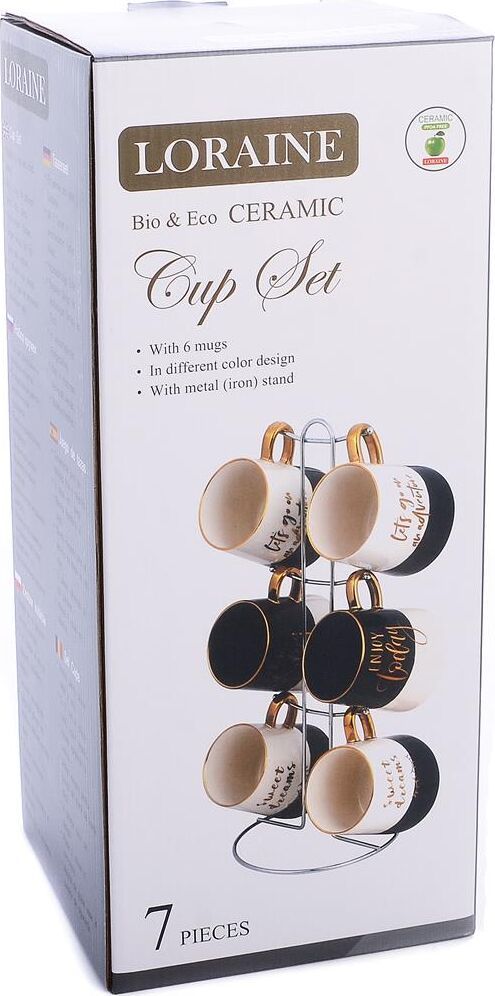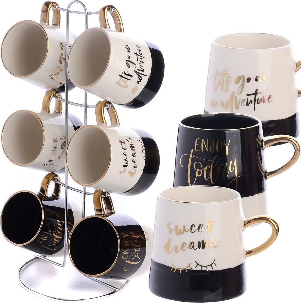 Чайный набор состоит из 6 чашек и 1 металлической подставки. Предметы набора изготовлены из высококачественной керамики. Изящный дизайн с золотистой отделкой придется по вкусу и ценителям классики, и тем, кто предпочитает утонченность и изысканность. Он настроит на позитивный лад и подарит хорошее настроение с самого утра. Набор кружек - идеальный и необходимый подарок для вашего дома и для ваших друзей в праздники. В комплекте - металлическая подставка с шестью крючками для подвешивания кружек.