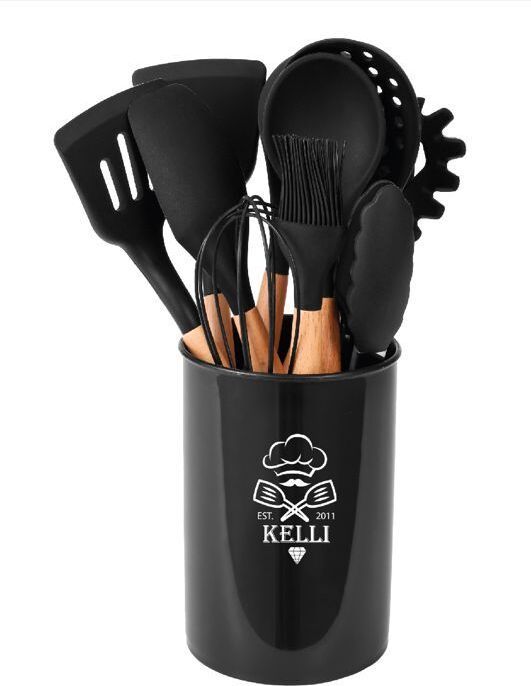 Набор кухонных принадлежностей 12 предметов: Лопатка для жарки; Кисточка; Щипцы; Лопатка кондитерская; Половник; Шумовка; Лопатка с отверстиями; Ложка для салатов; Венчик; Ложка; Ложка для спагетти; Состав: бамбук и силикон