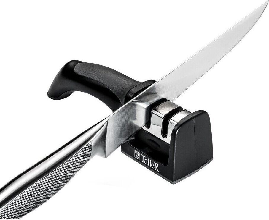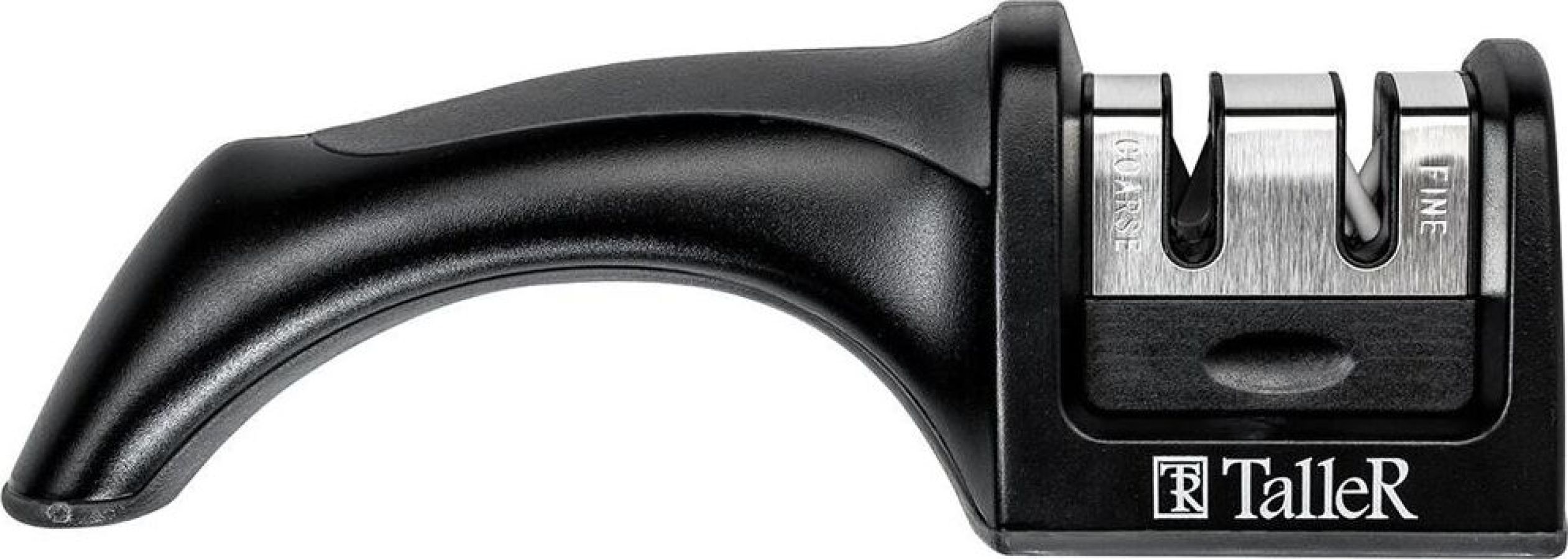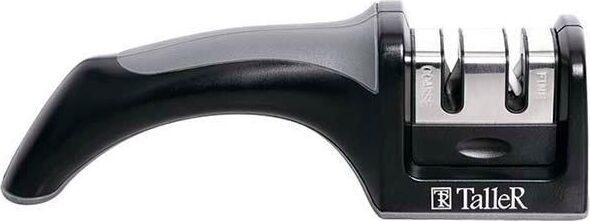 Точилка для ножей "Дженнис" • Размер: 19,1x5,1x6,4 см • 2-х ступенчатая заточка • Угол заточки: 20º • Материал: сталь, керамика, пластик, силиконовые протекторы на основании • Шлифовальный модуль из стали, модуль доводки из керамики •