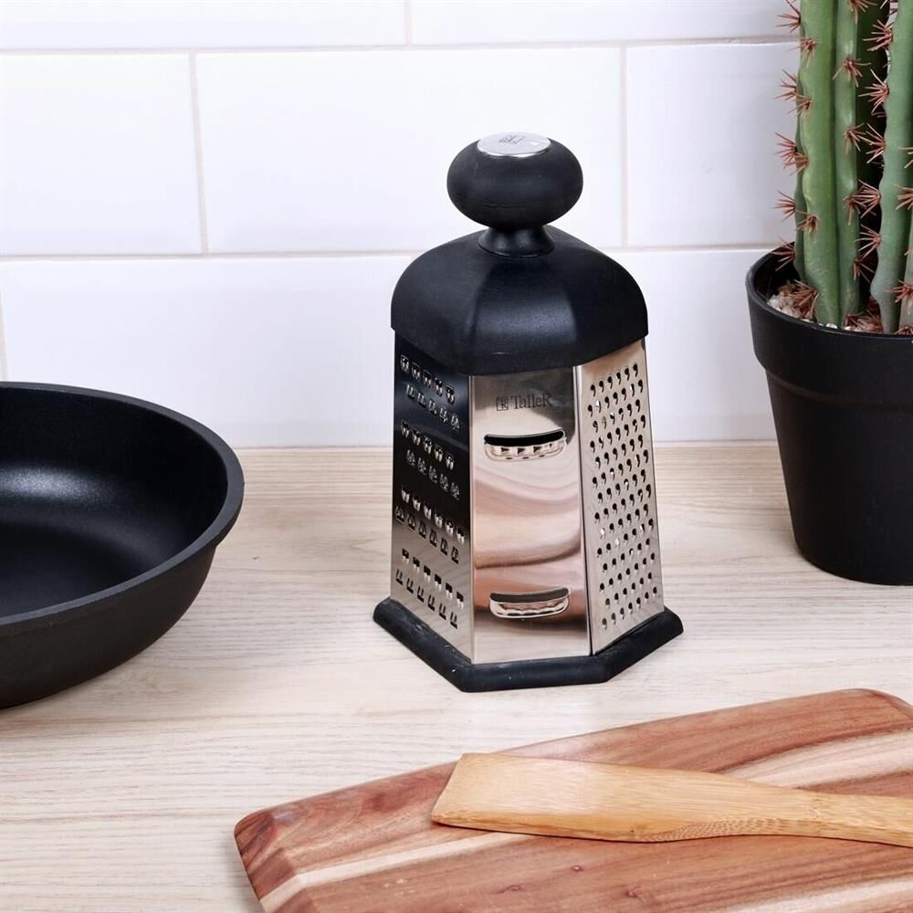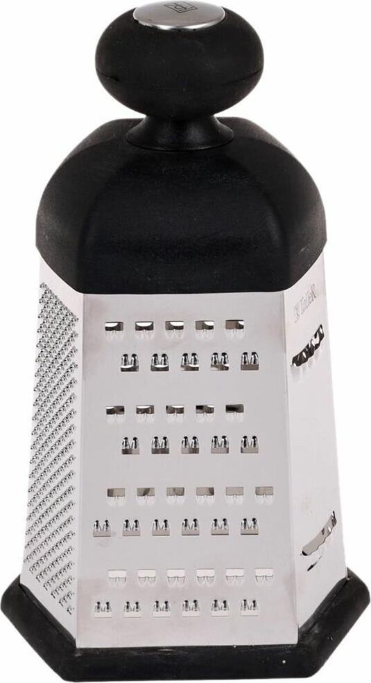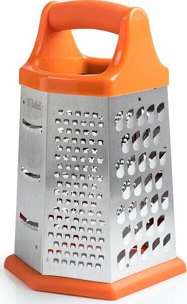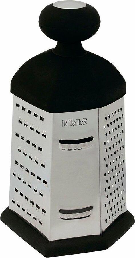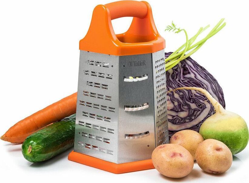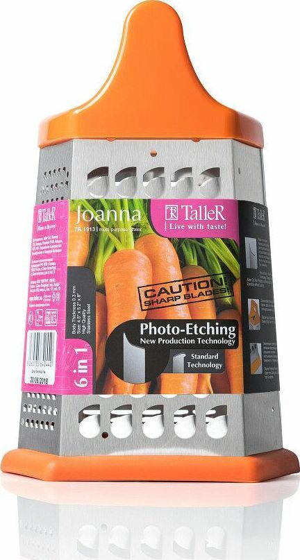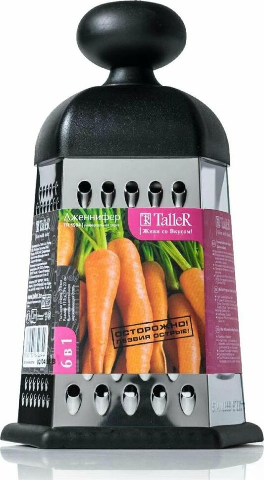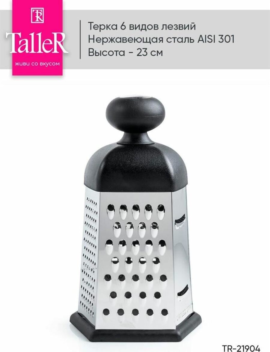 Высота 23 см.Основание 11,5 х 13,0 см 6 видов лезвий: крупная терка, средняя терка, мелкая терка, шинковка,фигурная шинковка, шредер.Удобная форма ручки и специальный материал обеспечивают надежную фиксацию в руке.Нескользящий силиконовый протектор на ос
