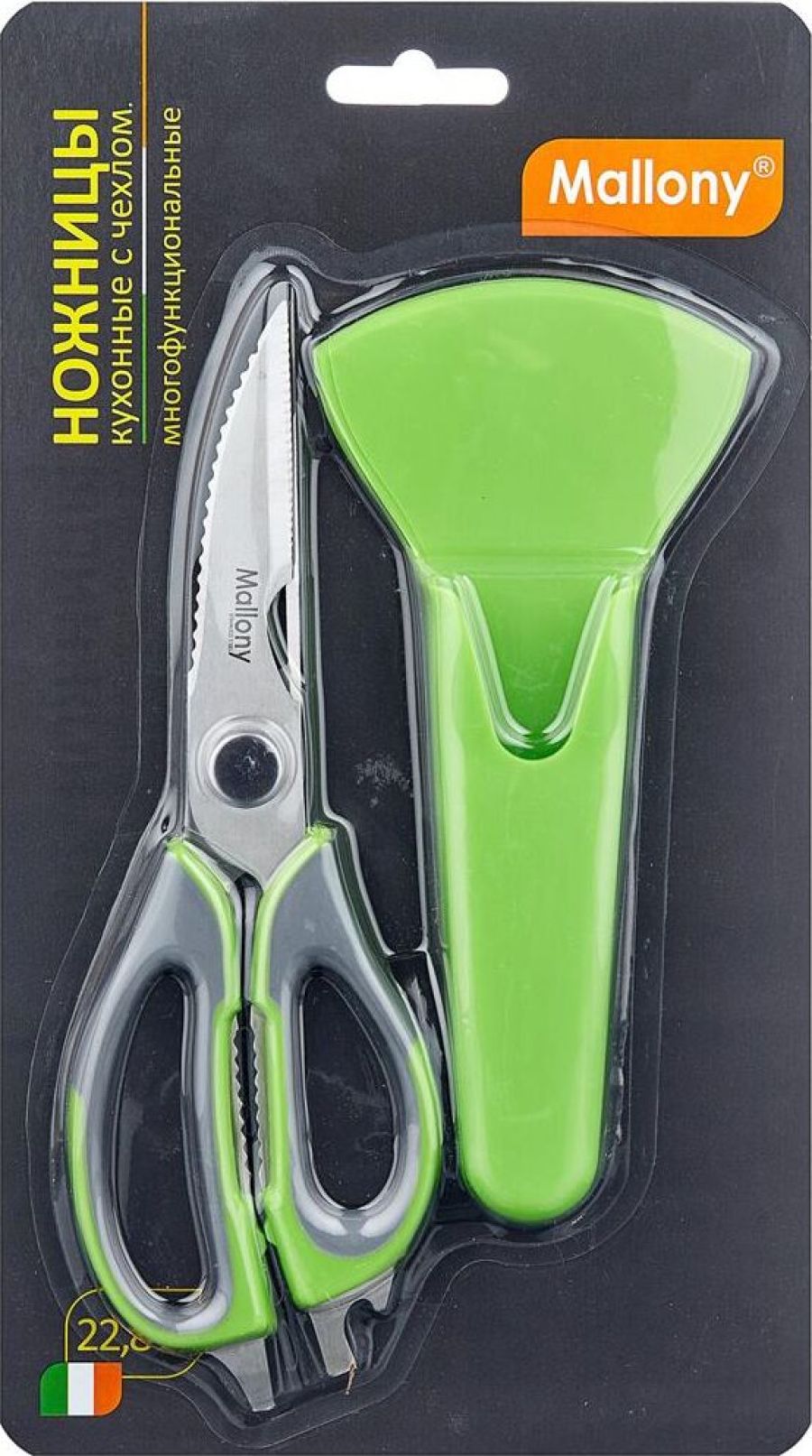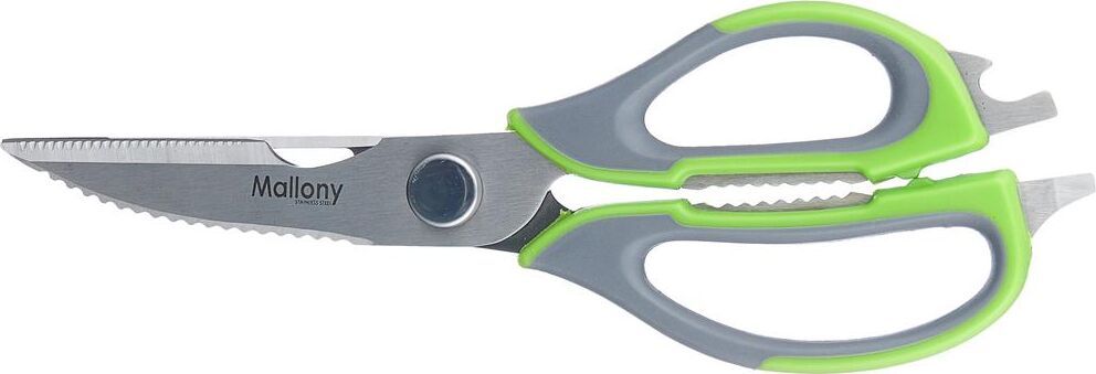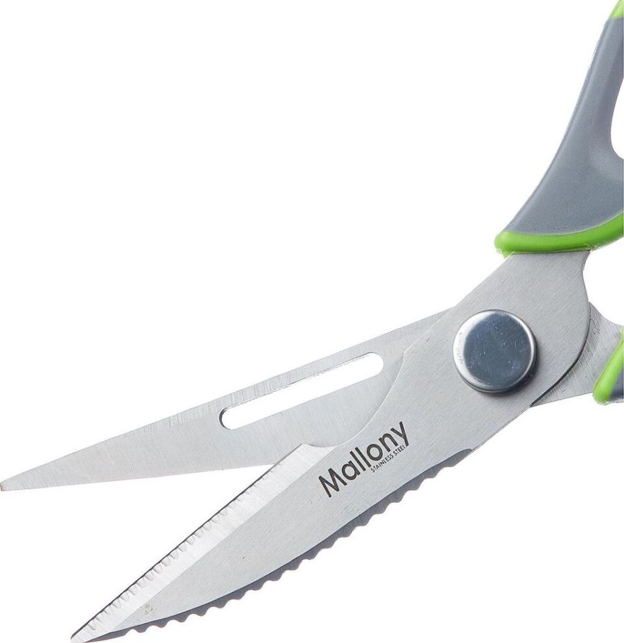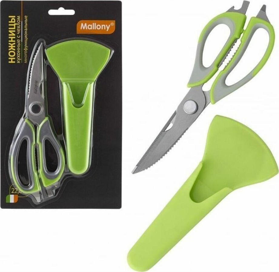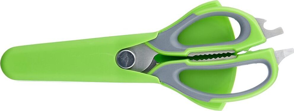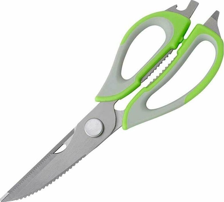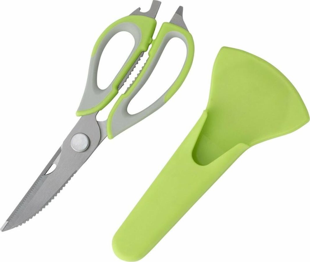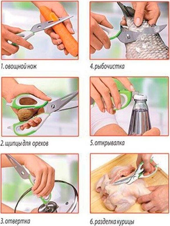 Длина ножниц: 22,8 см Удобный пластиковый чехол в комплекте Толщина стали: 2,8 мм Материалы: лезвие — нержавеющая сталь, ручка и чехол — пластик Ножницы предназначены для: - разделки птицы; - вскрытия картонных и полимерных упаковок; - чистки рыбы, срезания плавников (съемные лезвия); - в качестве ножа для овощей (съемные лезвия); - в качестве щипцов для колки орехов; - как консервный нож; - как открывашку для бутылок; - как овощечистку (съемные лезвия). Упаковка: европодвес