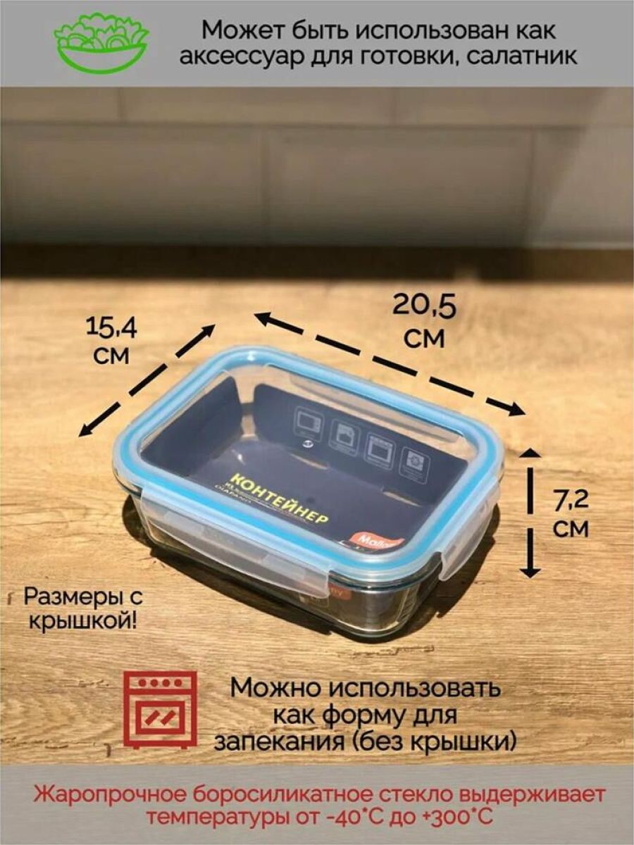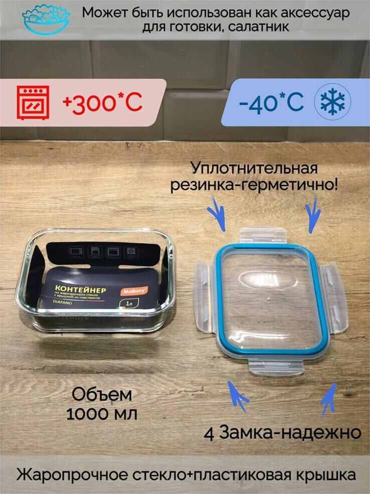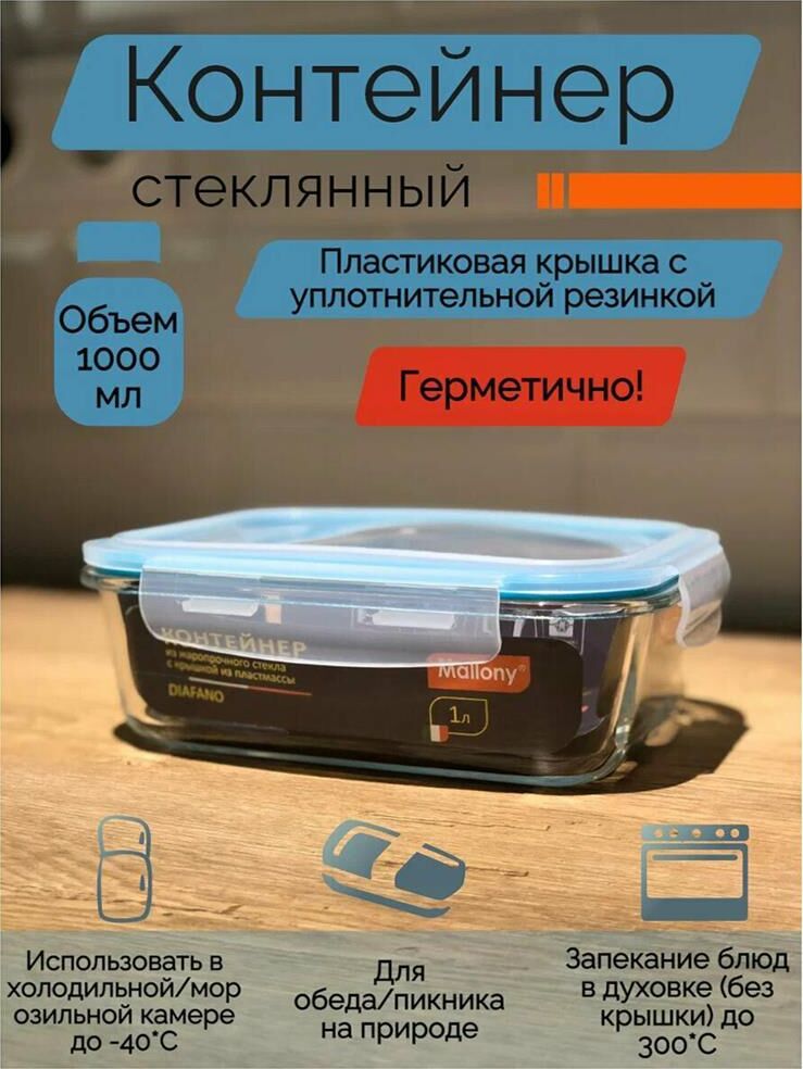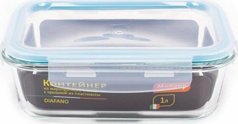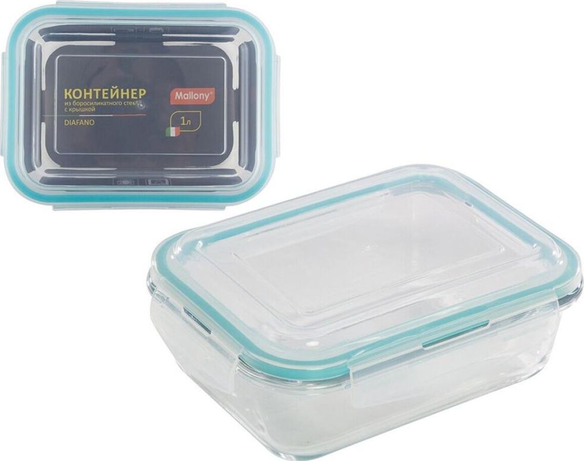 Контейнер DIAFANO,1000 мл из жаропрочного стекла с крышкой из пластм,прямоуг,темп режим -40 до +300С Объем: 1000 мл/Размер: 20.5×15.4×7.2 см Материалы: боросиликатное стекло, пластмасса, силикон. Подходит для использования в духовом шкафу (без крышки), микроволновке, морозилке, холодильной камере, можно мыть в посудомоечной машине. Нельзя использовать на газовых плитах, открытом огне. Толщина стекла — 5,5 мм Контейнер выдерживает температуры от минус 40 до плюс 300 С без резких перепадов. Упаковка: цветной вкладыш, пленка из PE, коробка с ячейками. Крышка с защёлками и силиконовой прокладкой герметично прилегает к контейнеру, благодаря этому удобно использовать контейнер в том числе и для первых блюд. Коэффициент линейного расширения — 8.3*10^-6