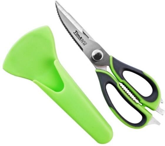 Ножницы многофункциональные (секатор, рыбочистка, овощерезка, открывалка для бутылок, консервный нож) предназначены для выполнения различных кухонных работ: нарезки свежей зелени или пиццы, вскрытия картонных или полимерных упаковок, разделки рыбы и птицы (срезание плавников, разрезание тушки цыпленка на порционные части). Также при помощи ножниц можно открыть бутылку или консервную банку. Овальная полость между ручками, снабженная зубцами, используется для колки орехов.