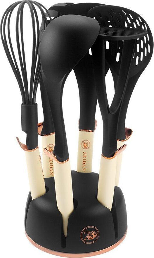 ZEIDAN Z-2066 Кухонный набор ZEIDAN Z-2066 7 предметов, Кухонный набор 7пр. ВЫСОКОКАЧЕСТВЕННЫЙ ЖАРОПРОЧНЫЙ НЕЙЛОН, подставка, лопатка с прорезями, шумовка, половник, картофелемялка, ложка для спагетти, венчик для взбивания, ручки soft-touch с декоративным элементом "под золото" . Подарочная упаковка с пластиковой ручкой.