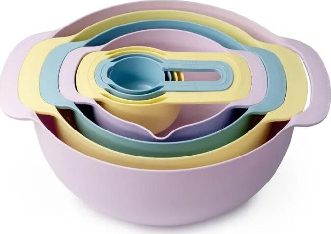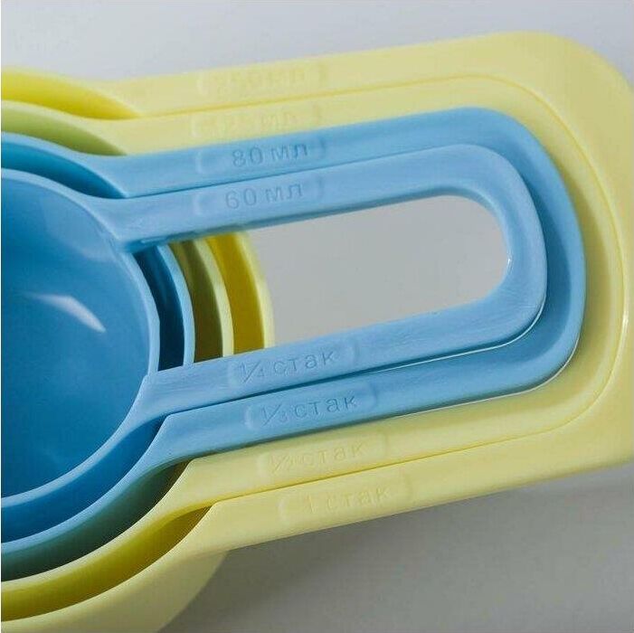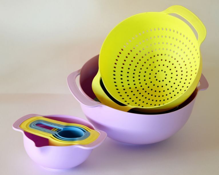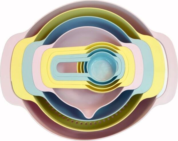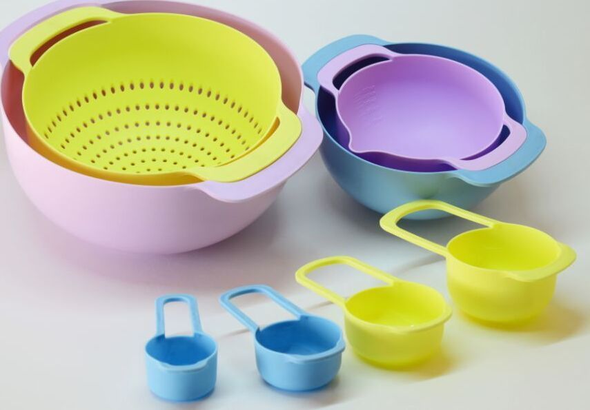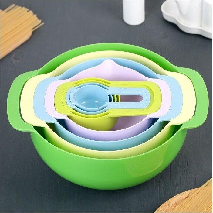 Набор мисок из 8 предметов. Набор Мисок Good&Good станет важным дополнением вашей кухни. Набор для кухни способен помочь вам точно отмерять необходимое количество муки, специй и других ингредиентов. Миска изготовлена из качественного полипропилена, который не деформируется и не выделяет вредные вещества. Стоит отметить, что все предметы набор емкостей вставляются друг в друга для компактного хранения. Салатник легко мыть, в т.ч. в посудомоечной машине. Температурный режим: +90 -40. Эргономичная ручка чаши, помогает удобно держать миску во время взбивания, а сливной носик удобен для переливания. Набор Посуды состоит из 8 пластиковых приборов: ** миска для смешивания 4,5 л; чаша с мерной шкалой 1,2 л; миска с носиком 0,8л; дуршлаг диаметром 22 см; мерные ложки в наборе 250 мл, 125 мл, 80 мл и 60 мл.