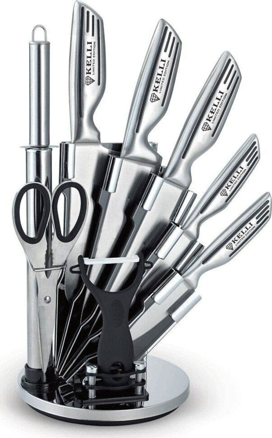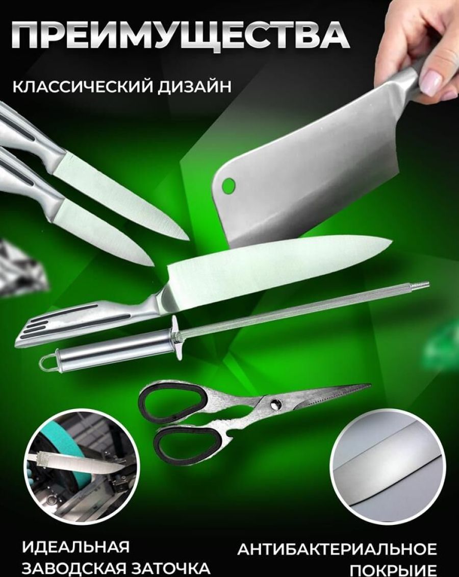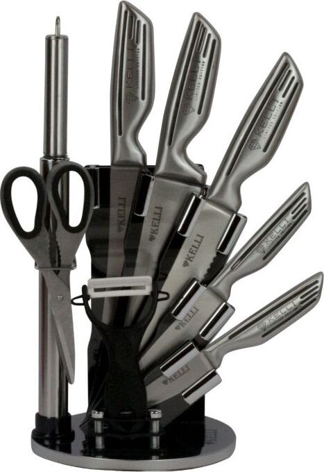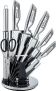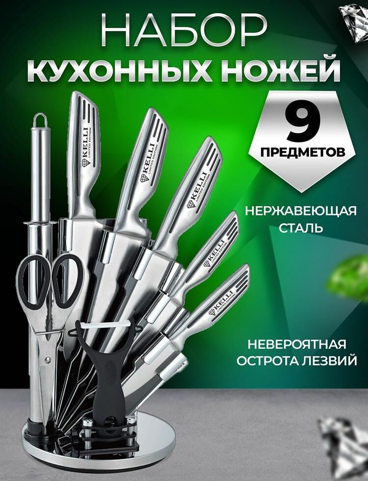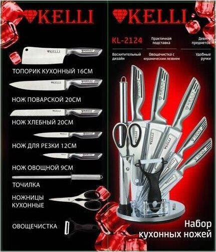 Тип: набор кухонных ножей.Количество предметов в наборе: 9.Материал лезвия: нержавеющая сталь.Комплектация: Нож поварской, нож для резки, нож разделочный, нож универсальный,нож овощной, ножницы кухонные, подставка