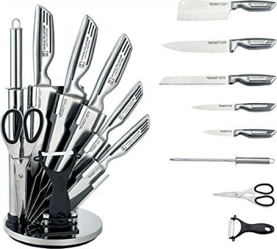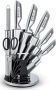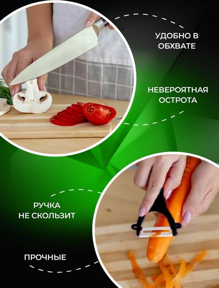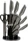 Комплектация: - топорик кухонный 16 см;<br> - нож поварской 20 см;<br> - нож хлебный 20 см;<br> - нож для резки 12 см;<br> - нож овощной 9 см;<br> - ножницы кухонные;<br> - керамическая овощечистка;<br> - точилка;<br> - подставка