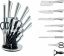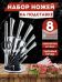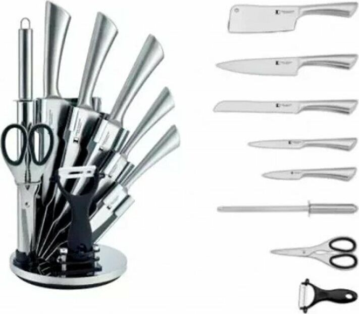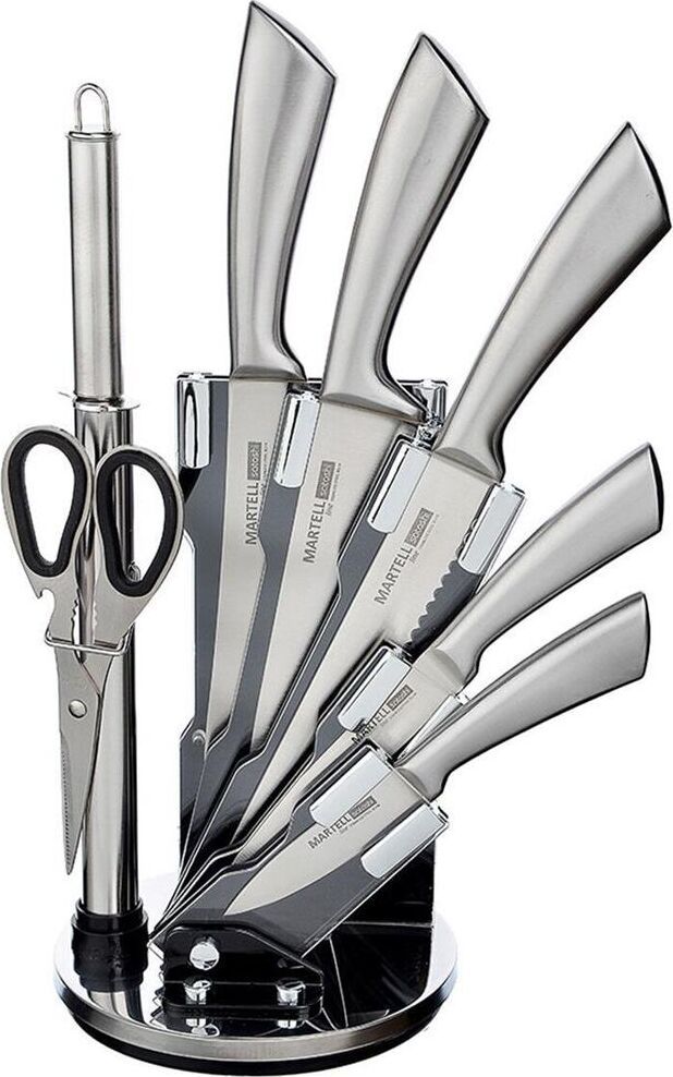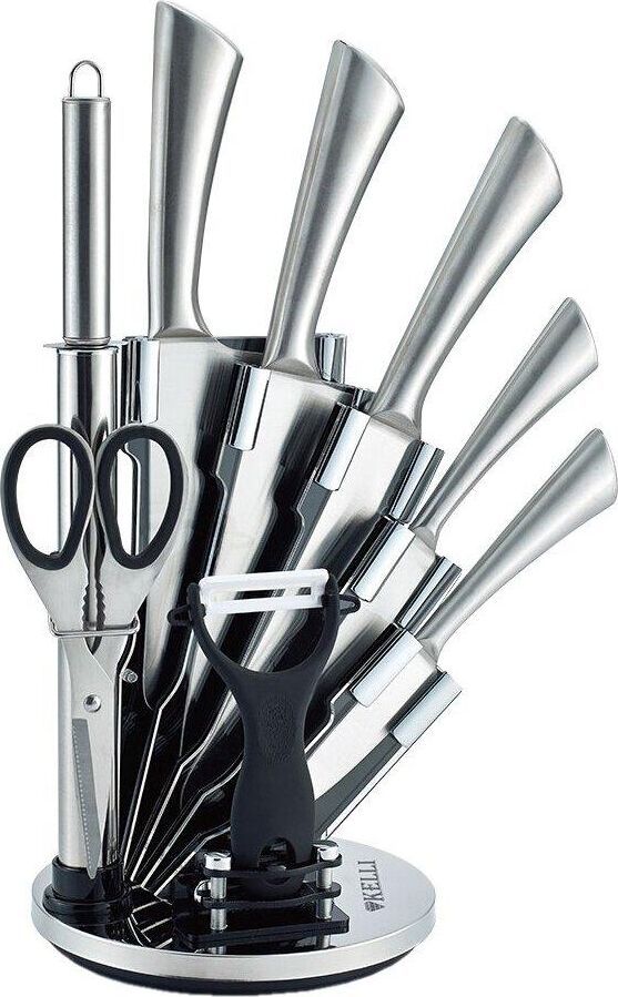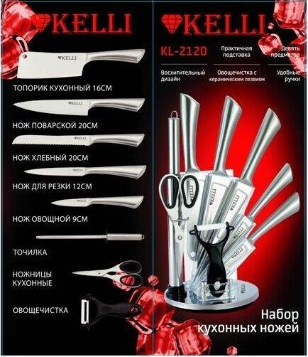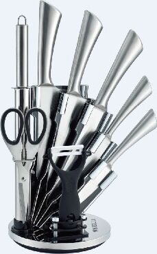 Комплектация: - топорик кухонный 16 см;<br> - нож поварской 20 см;<br> - нож хлебный 20 см;<br> - нож для резки 12 см;<br> - нож овощной 9 см;<br> - кухонные ножницы;<br> - точилка;<br> - овощечистка;<br> - подставка