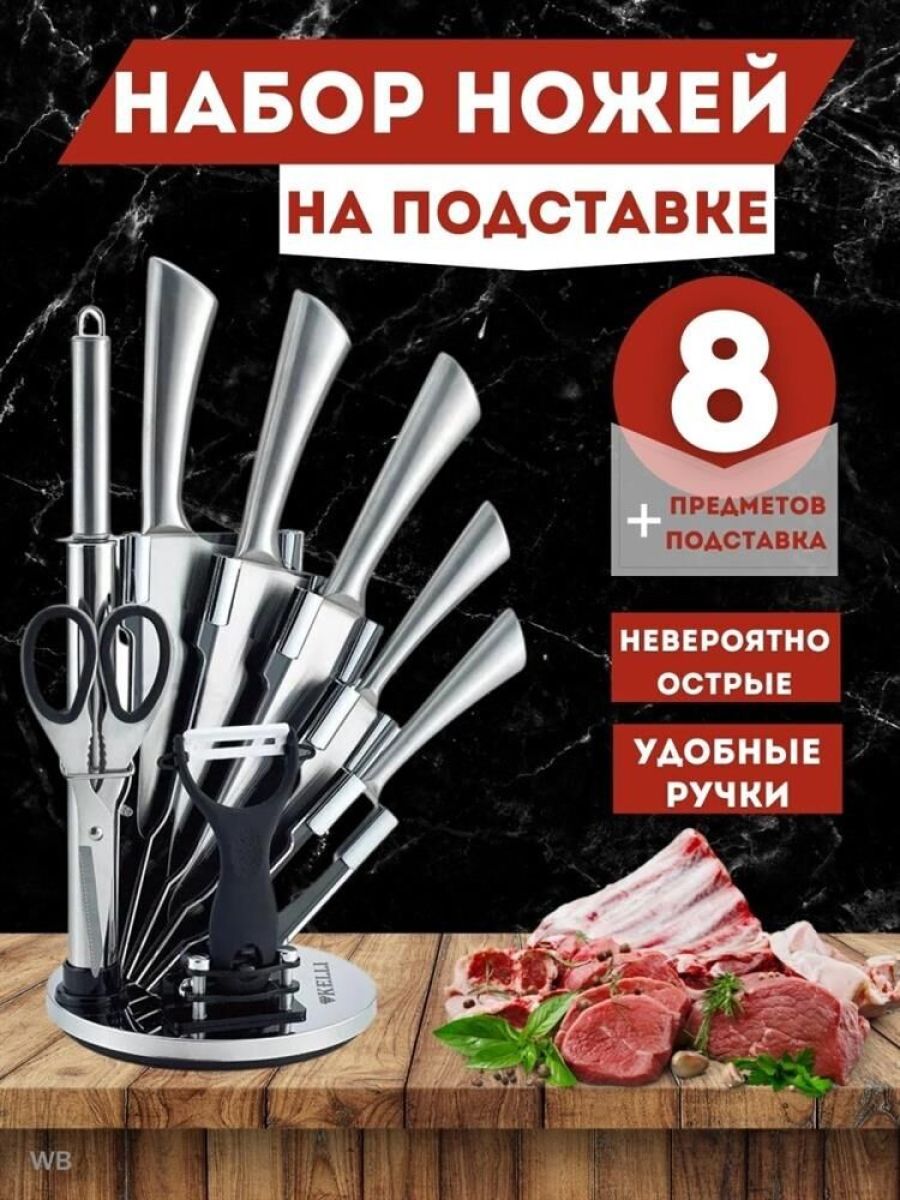 Набор кухонных ножей на подставке Высококачественная сталь 9 предметов: Топорик кухонный 16см, Нож поварской 20см, Нож хлебный 20см, Нож для резки 12см, Нож овощной 9см, Точилка, Ножницы Овощечистка с керамическим лезвием. Острая режущая кромка Легкая заточка Удобные ручки Восхитительный дизайн Практичная подставка