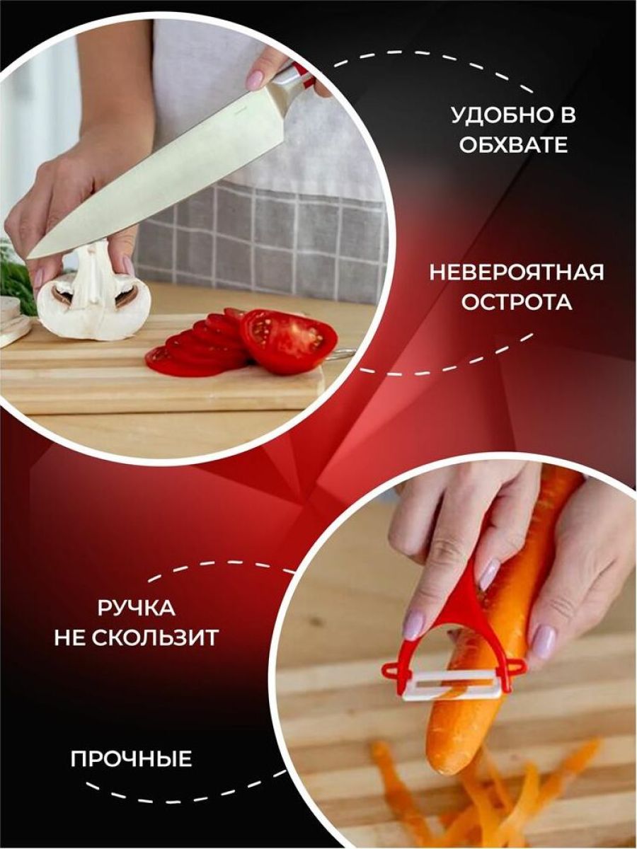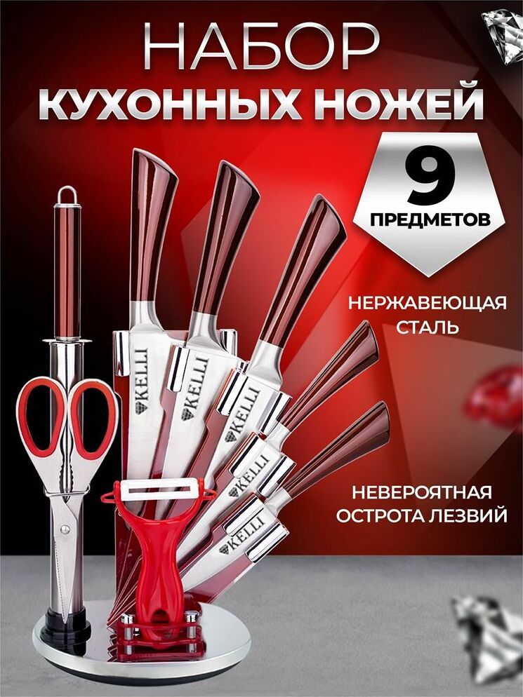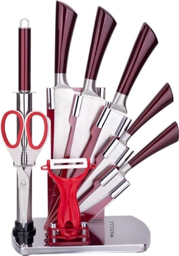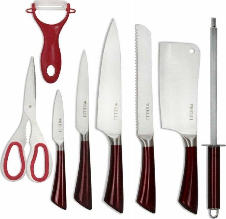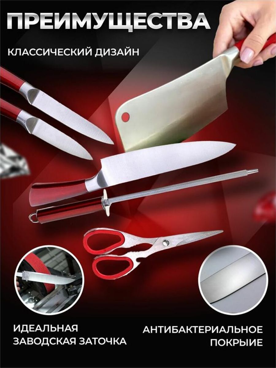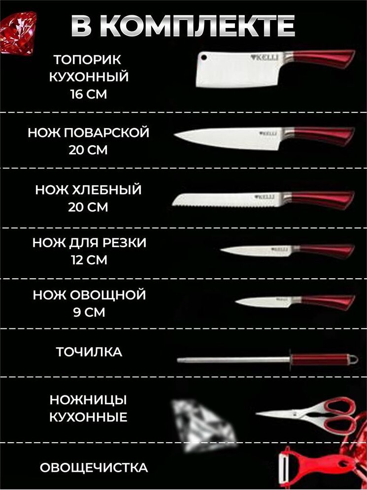 8 ПРЕДМЕТОВ: 1.Топорик кухонный 7", 2.Нож поварской 8",; 3.Нож хлебный 8", 3.Нож для резки 6", 5.Нож овощной 5", ; 6.Кухонные ножницы, 7.Точилка, 8.ПОДСТАВКА. Высококачественная нержавеющая сталь 18/10. Невероятная острота лезвий.