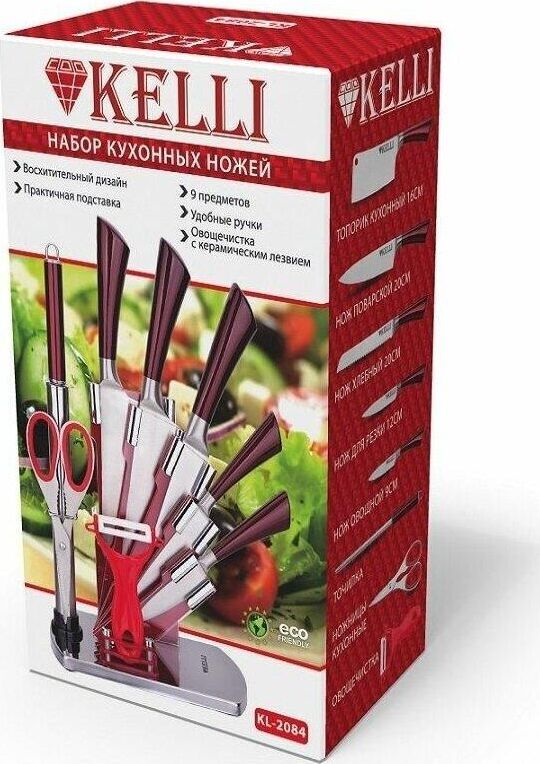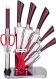 Комплектация: - топорик кухонный 16 см;<br> - нож поварской 20 см;<br> - нож хлебный 20 см;<br> - нож для резки 12 см;<br> - нож овощной 9 см;<br> - точилка;<br> - ножницы;<br> - овощечистка;<br> - подставка