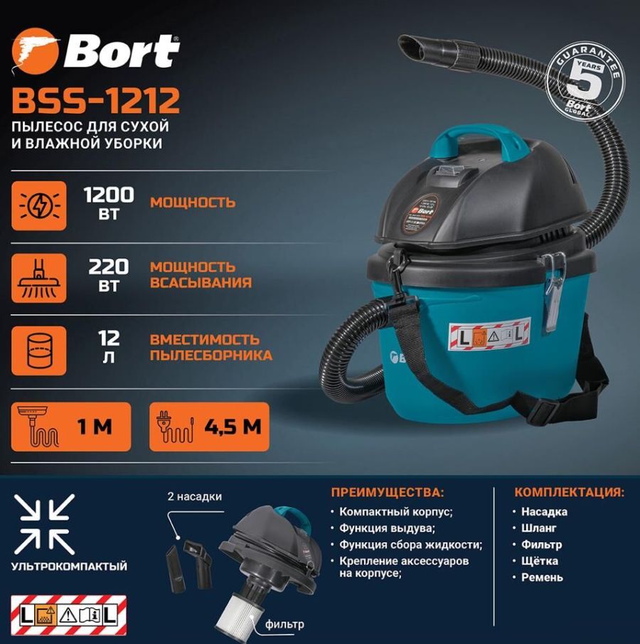 Расход воздуха 30 л/сек; 58 л/сек; Вместимость бака 12 л; Потребляемая мощность 1200 Вт; Разрежение 18 кПа; Тип пылесоса Пылесос для влажной уборки; Байпасный; Тип уборки Сухая и влажная уборка; Длина шланга 1 м; Диаметр шланга 35 мм; Мощность всасывания 220 Вт; Тип пылесборника Патронный HEPA фильтр; Класс пыли "L"; Пластик; Система очистки фильтра Ручная; функция сбора жидкости; функция выдува; Длина кабеля 4,5 м; Уровень шума 82 дБ; Съёмный резервуар для моющего раствора Нет л; Вес изделия 3,6 кг; Напряжение 220 В; Частота тока 50 Гц; Вес брутто=4,2 (Вес нетто=3,6) кг; 34,6 x 27,5 x 40,6; Насадка, Шланг, Фильтр, Щетка, Ремень; Компактный корпус, Функция выдува будет полезна как в мастерской так и на садовом участке, Функция сбора жидкости, Крепление аксессуаров на корпусе пылесоса; гарантия 2 г