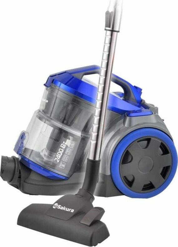 2400Вт, макс.мощность всасывания 450 Вт, HEPA-фильтр, уровень шума ≤78 дБ, контейнер д/сбора пыли 2.0 л (циклонная система), индикатор заполнения пылесборника, металлич. телескопич. труба, автоматическое сматывание шнура. Многофункциональные насадки: насадка ковер/пол, насадка для мебели, щелевая насадка. Цвет корпуса: синий/черный