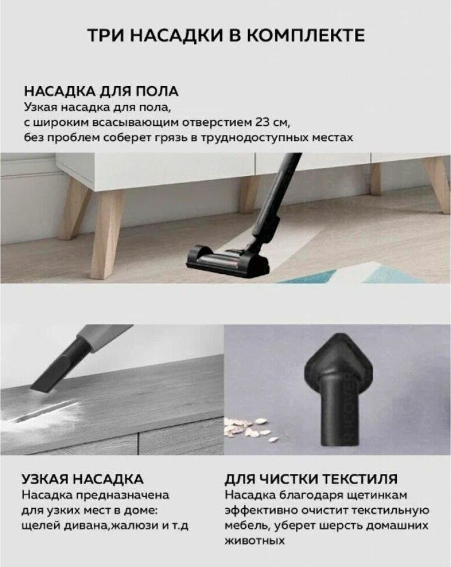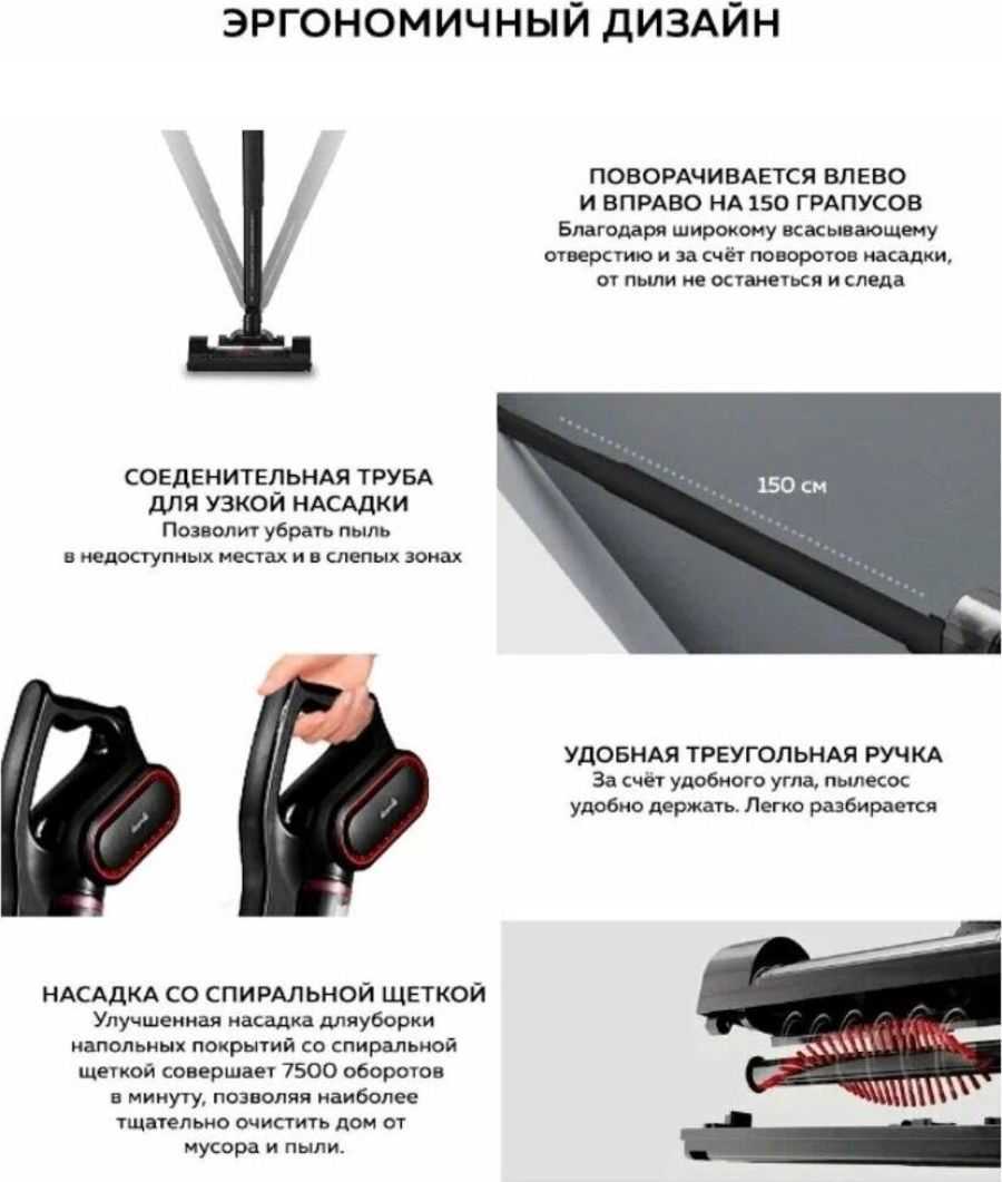 Легкий и удобный вакуумный пылесос, который трансформируется из ручного в компактный, легко проходит в труднодоступные места, Мощный и с низким уровнем шума, Контейнер для пыли очищается без контакта с кожей рук, Тройная система фильтрации с HEPA фильтром не пропускает аллергены назад в помещение, 3- насадки пылесоса удовлетворят различные нужды. Напольная насадка оснащена спиральной щеткой, приводимой в движение силой воздушного потока, для лучшего очищения ямок и щелей. Управление одной щеткой экономит время и усилия.