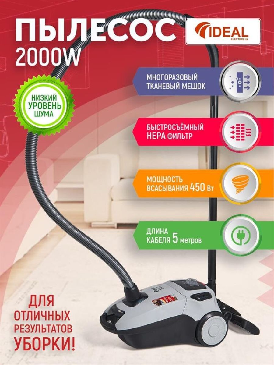 Класс энергопотребления А. Тип пылесоса с мешком. Тип уборки Сухая. Мощность всасывания 450 Вт. Потребляемая мощность 2000 Вт. Объем пылесборника 2,3 л. Регулировка мощности на корпусе. Тип фильтра микрофильтр. Насадки для ламината/ паркета, пол-ковер,щелевая. Дополнительные насадки Щетка для пыли. Фильтрация НЕРА. Длинна шнура 5 метров. Автосматывание шнура есть. Парковка универсальная. Расход воздуха 41л/с. Разрежение 33 кпд. Уровень шума 82дБ. Плавный запуск двигателя SOFТSTART.
