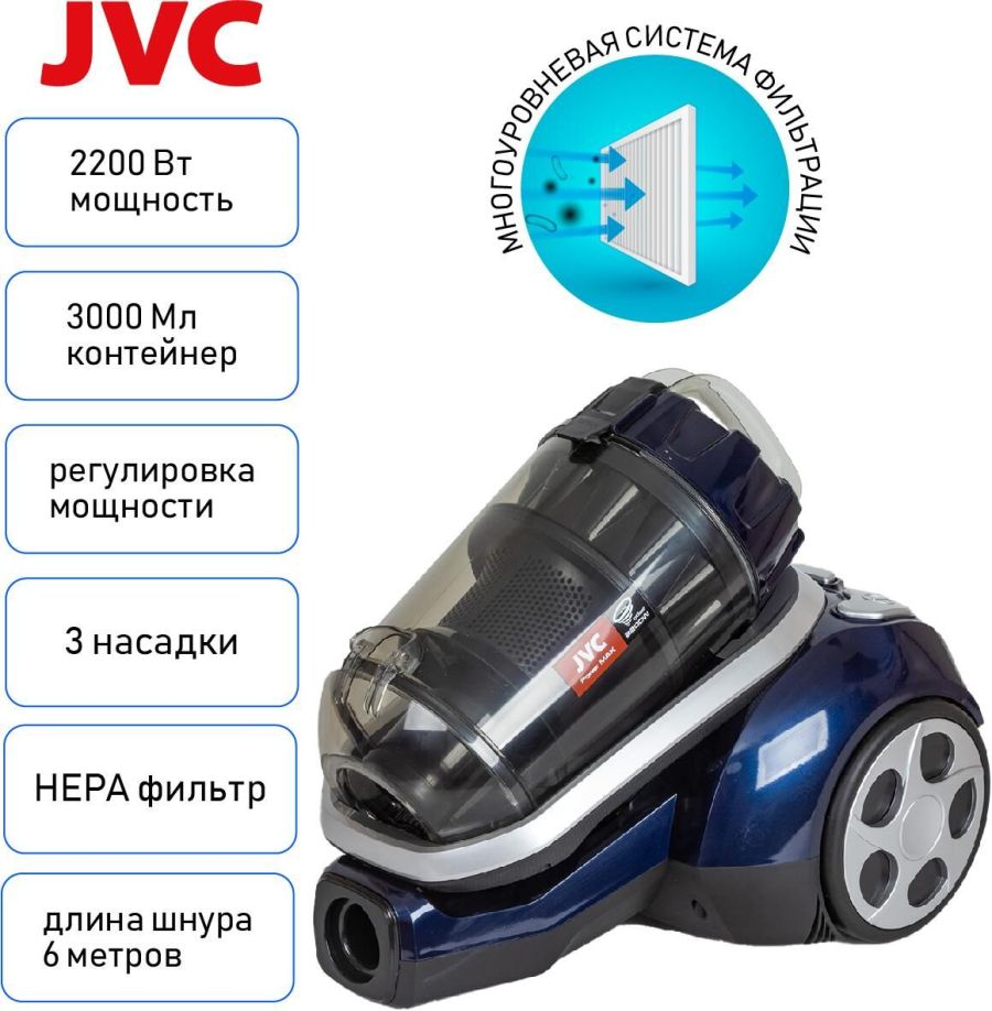 Пылесос циклонного типа, мультициклон,, максимальная мощность 2200 ватт, объем контейнера 3 литра, моющийся фильтр HEPA, регурировка уровня мощности, управление воздушным потоком на ручке, уровень шума 79 дБ, металлическая телескопическая трубка, универсальная щетка ковер/пол, щелевая насадка 2 в 1, насадка для мягкой мебели, держатель для аксессуаров, автоматическая смотка шнура, длина кабеля 6 метров