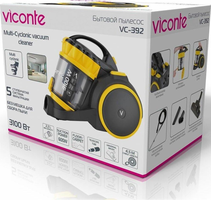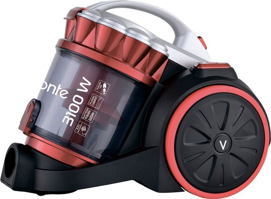 Бытовой пылесос, Мощность 3100 Вт, мощность всасывания - 600Вт, эффективная система очистки воздуха «Мультициклон» с 5-ти ступенчатой системой фильтрации воздуха, лёгкая очистка контейнера, металлическая телескопическая трубка, регулятор потока воздуха на трубке, длина шнура питания 4.5 м, автоматическая смотка шнура. В комплекте: комбинированная щётка с металлическим основанием ковёр/пол, насадка "мебель/щель".