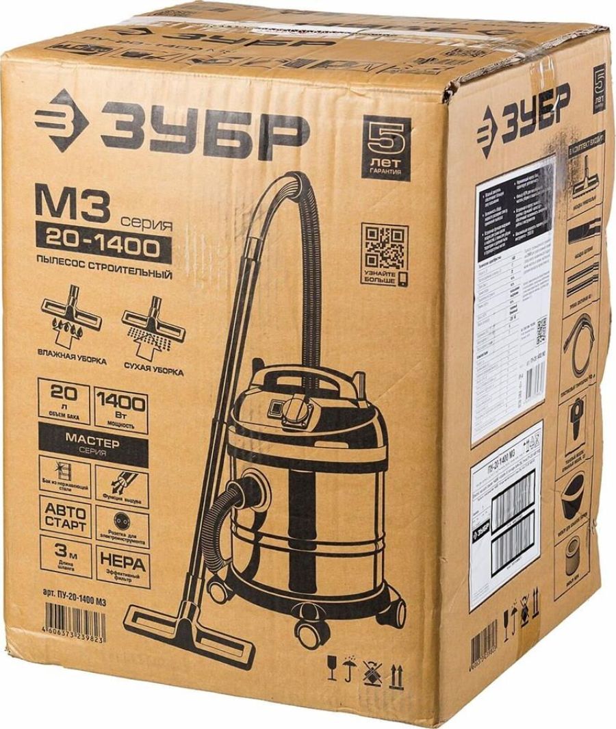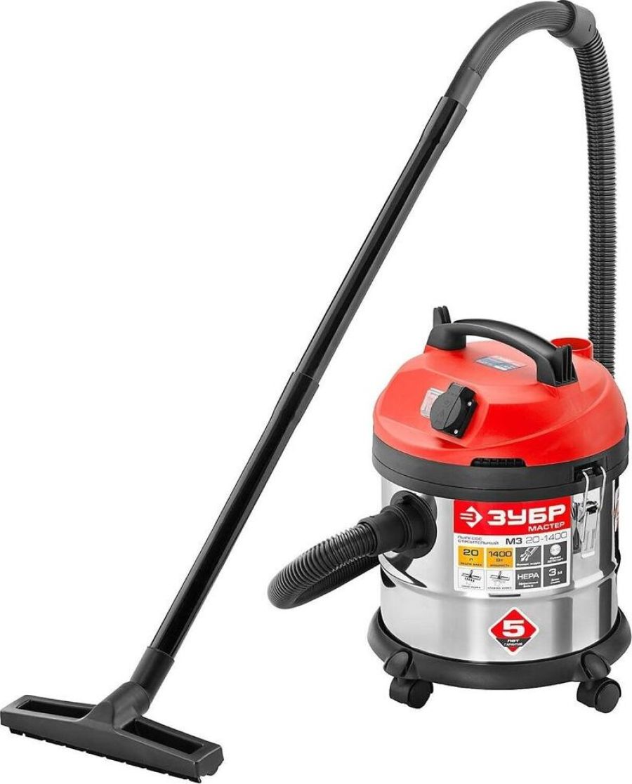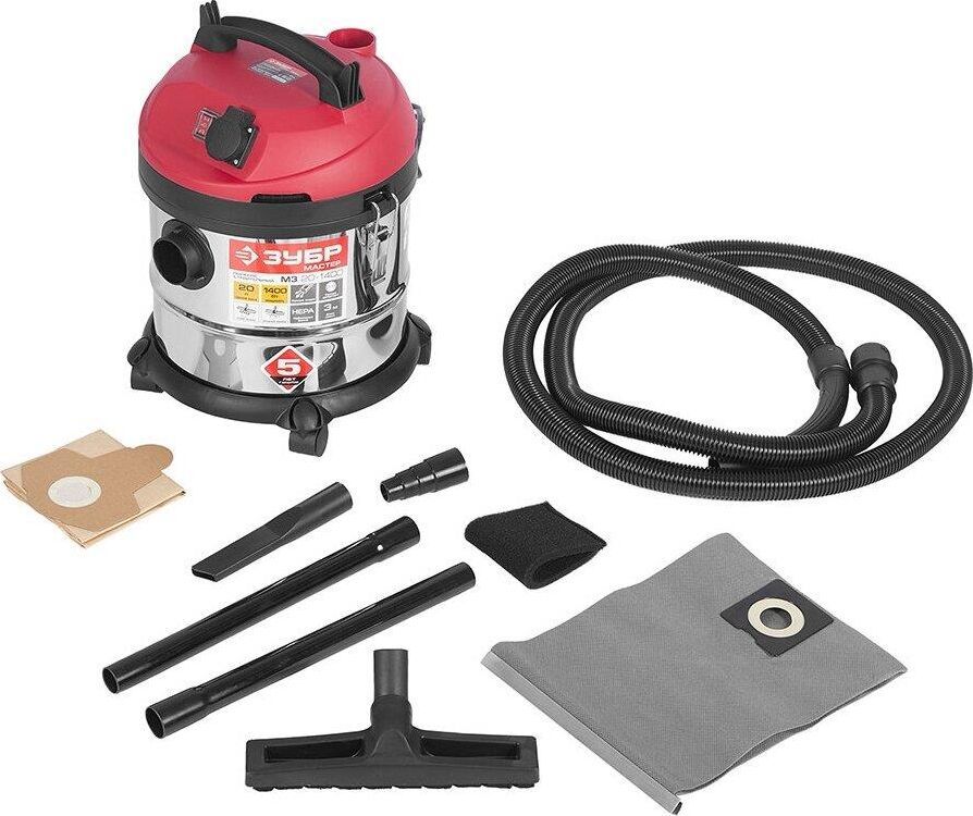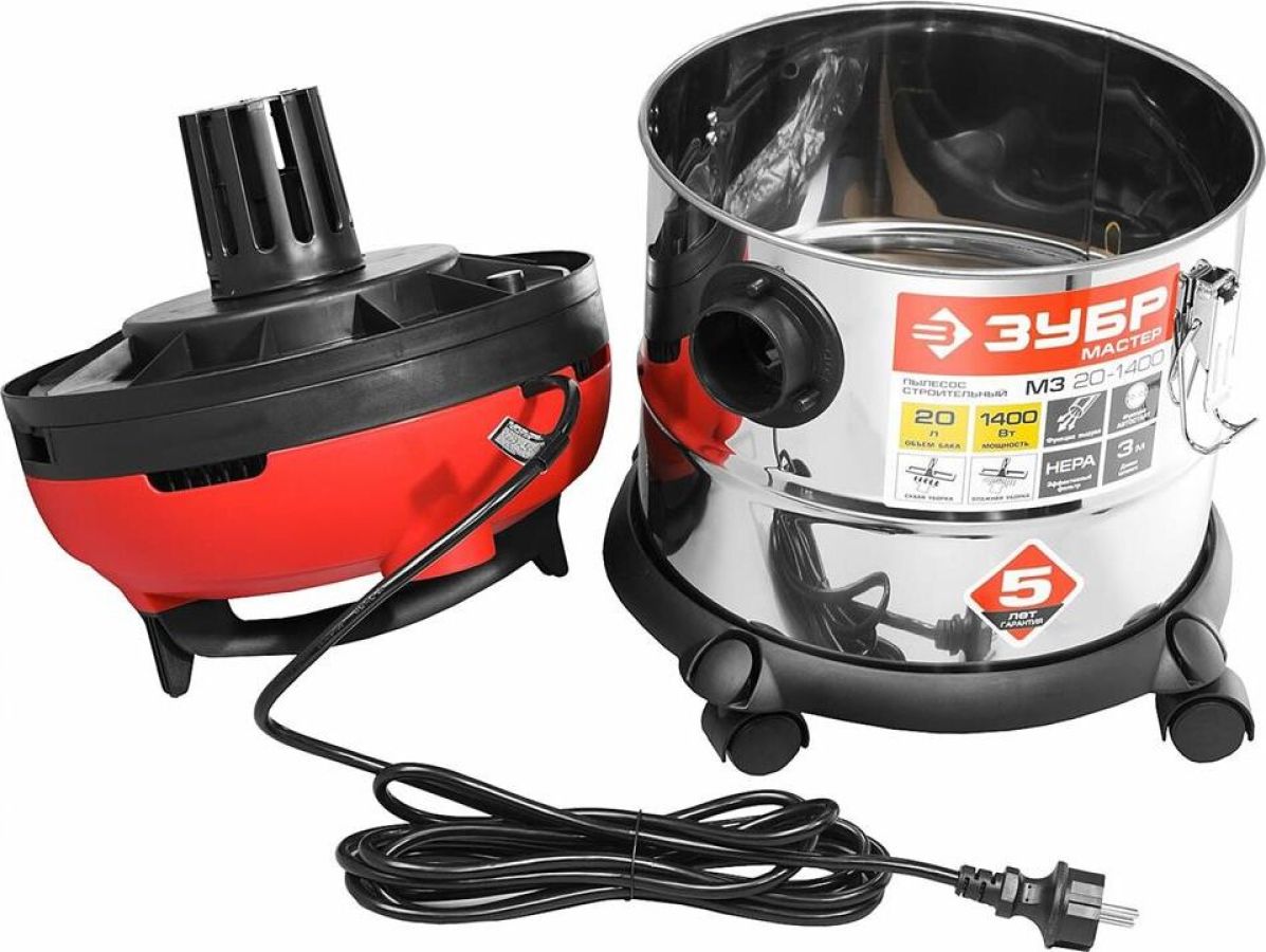 Строительный пылесос ЗУБР Мощностью 1400 Вт предназначен для уборки помещений, а также для принудительного удаления продуктов пиления, строгания, фрезерования и т.п. из рабочей зоны электроинструмента. Он незаменим для поддержания чистоты в гараже, мастерской, удаления мусора во время ремонта в квартире или на даче. Бак из нержавеющей стали объемом 20 л очень долговечен. а синхронное включение с инструментом, подключенным через розетку пылесоса позволит сохранить чистоту на рабочем месте. Многоразовый мешок с возможностью очистки для сбора мусора при сухой уборке помещений. Класс пыли -L, Фильтр -HEPA, Функция выдувания , Влажная уборка, Длина всасывающего шланга, м -3, Присоединительный диаметр всасывающего шланга, мм -31, Внеш. диаметры патрубка-переходника, мм 41, 35, 33, 28, Длина кабеля, м -4.5 Напряжение питания, В/Гц 220±10% /50 Габариты, см 36х35х45