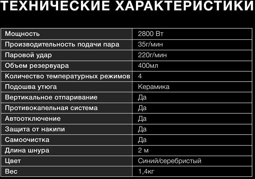 Мощность 2800 Вт Производительность подачи пара 35 г/мин Паровой удар 200 г Емкость для воды 400 мл Подошва утюга керамическая Enviro Ceramic Вертикальное отпаривание ДА Распылитель воды ДА Противокапельная система ДА Автоотключение ДА Самоочистка от накипи ДА Длина шнура 2 м Мерный стакан ДА Особенности LED индикация