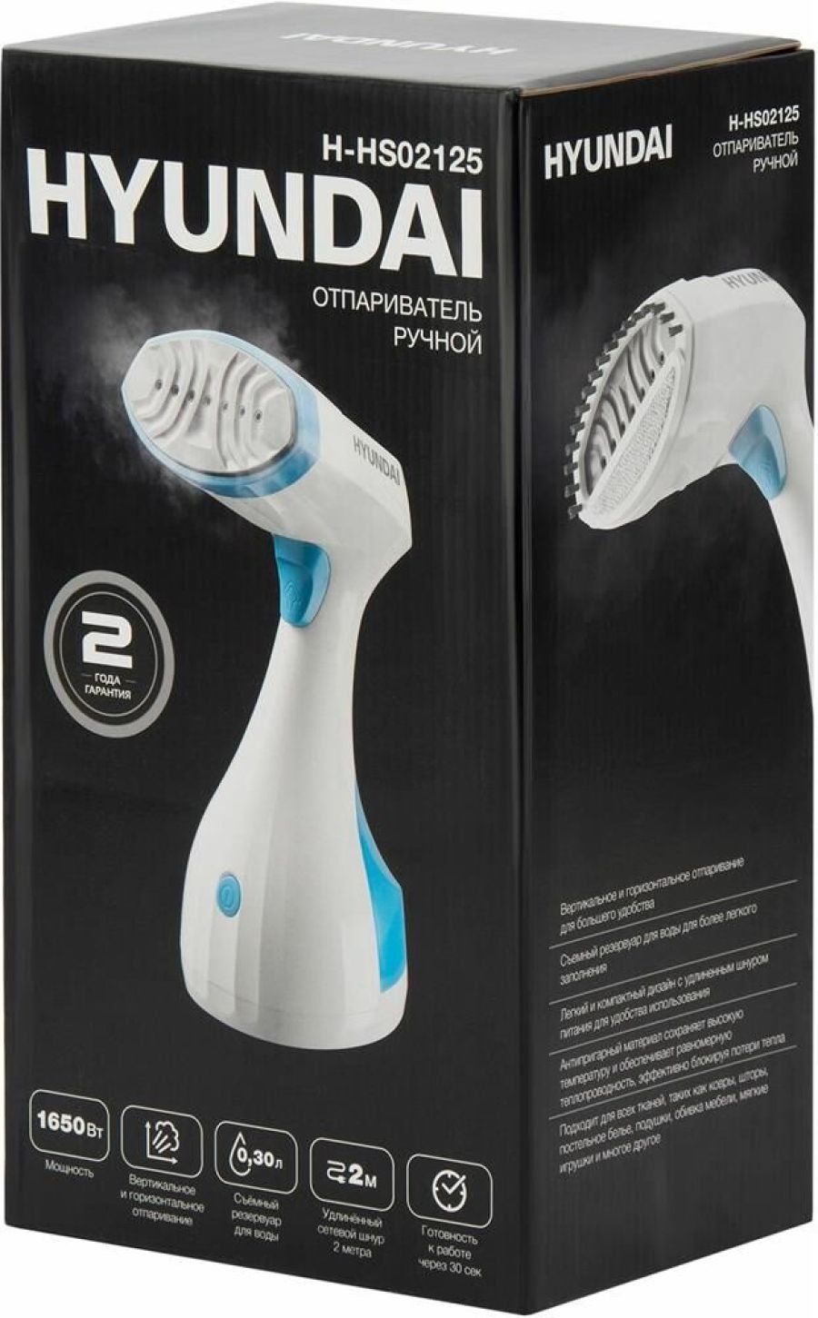 Мощность: 1650 Вт Мощность подачи пара до 30 г/мин Съемный резервуар для воды объемом 0.3 л Подходит для любых типов ткани Противокапельная система Горизонтальное и вертикальное отпаривание (2 в 1) Максимальная температура пара 150 °C Время непрерывной работы до 12 мин Постоянная подача пара Использование только дистилированной воды Долив воды во время работы Защита от перегрева Комплектация: Насадка-щетка 1 шт. Длина сетевого шнура 2 м