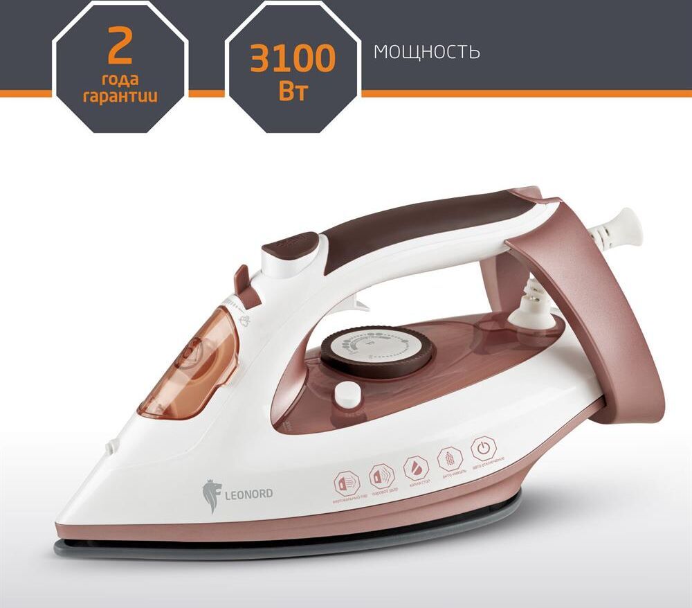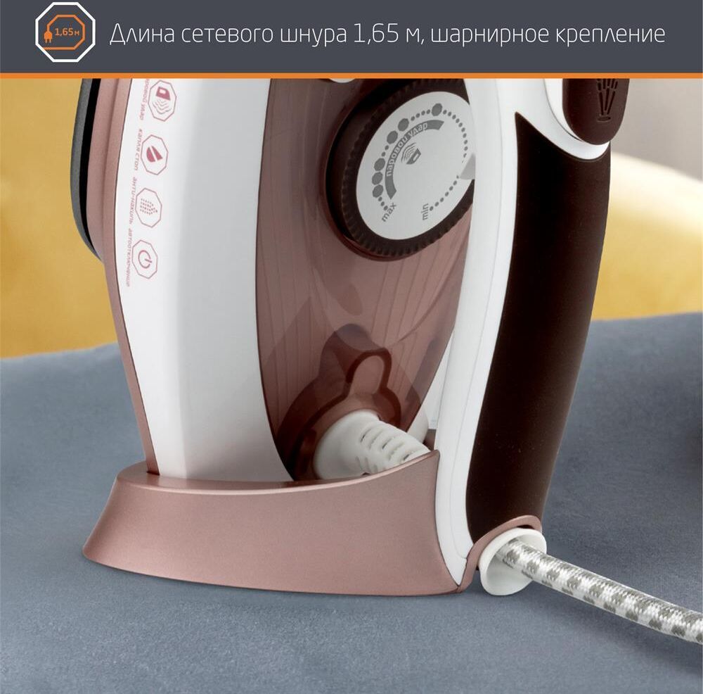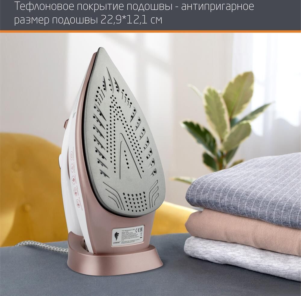 Мощность 3100Вт Подошва с тефлоновым покрытием Сухая глажка/спрей/пар/паровой удар/вертикальное отпаривание Индикатор нагрева Функция автоотключение Функция самоочистки Функця "капля стоп" Функция защиты от накипи Объем резервуара для воды 280 мл Паровой удар 0,8 г/удар Подача пара 30г/мин Регулировка подачи пара Шарнирное крепление шнура Длина сетевого шнура 1,7м Размер подошвы 22,9*12,1см Зауженный носик Мерный стакан в комплекте Защита от перегрева