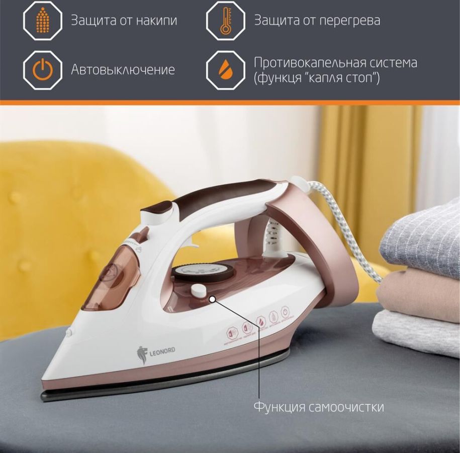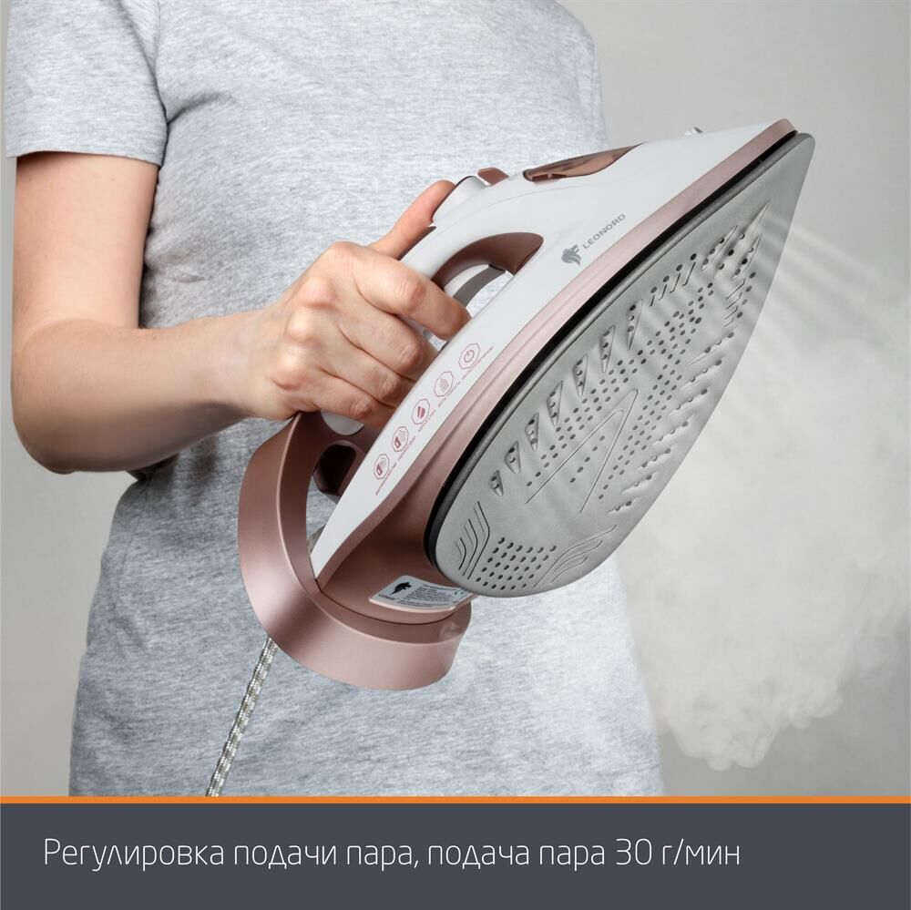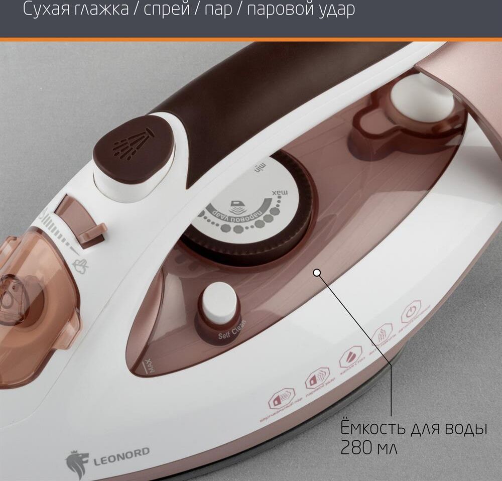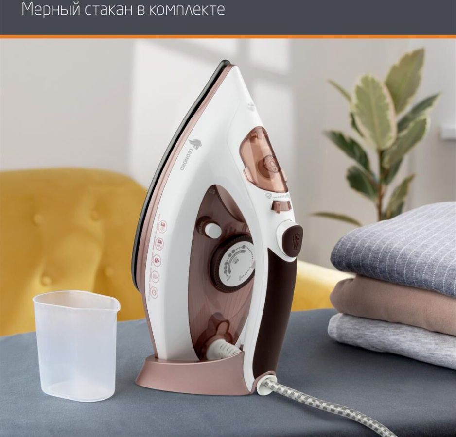 Мощность 3100Вт Подошва с тефлоновым покрытием Сухая глажка/спрей/пар/паровой удар/вертикальное отпаривание Индикатор нагрева Функция автоотключение Функция самоочистки Функця "капля стоп" Функция защиты от накипи Объем резервуара для воды 280 мл Паровой удар 0,8 г/удар Подача пара 30г/мин Регулировка подачи пара Шарнирное крепление шнура Длина сетевого шнура 1,7м Размер подошвы 22,9*12,1см Зауженный носик Мерный стакан в комплекте Защита от перегрева