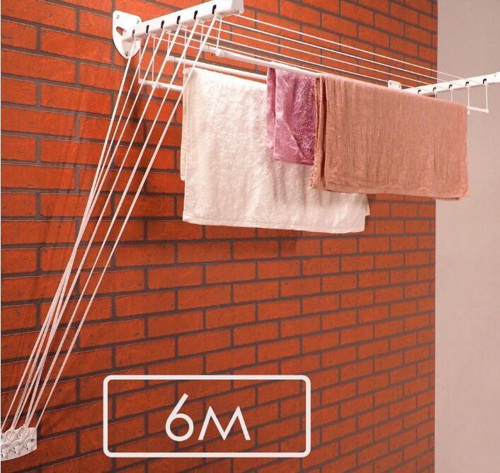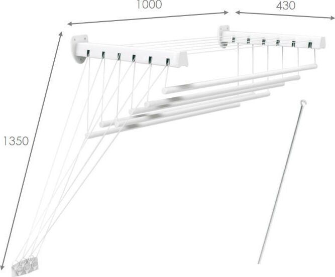 ЦВЕТ: белый. РАЗМЕР ИЗДЕЛИЯ: 430 x 1 000 x 1 350 мм. МАТЕРИАЛ: металл + полипропилен. Представляет из себя конструкцию из крепежных кронштейнов, штанг-трубок, на которых развешивается бельё, и веревочной системы для фиксирования штанг на двух разных положениях: на высоте комфортной для развешивания белья и на высоте для сушки белья. Суммарная длина поверхности для размещения белья - 6м. Максимальная нагрузка - 12кг.