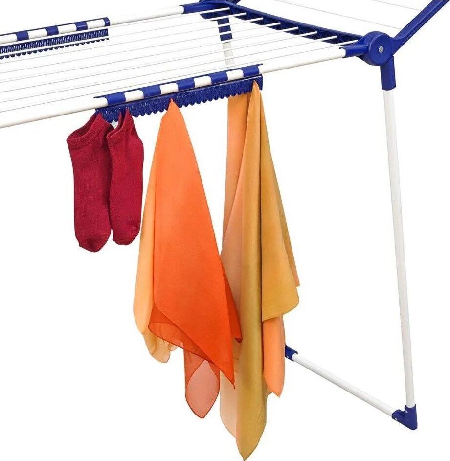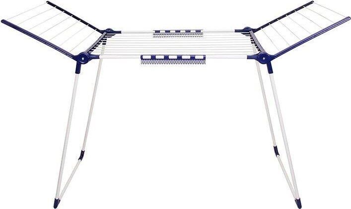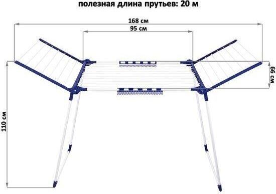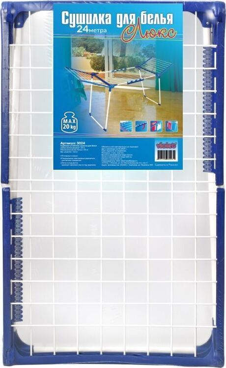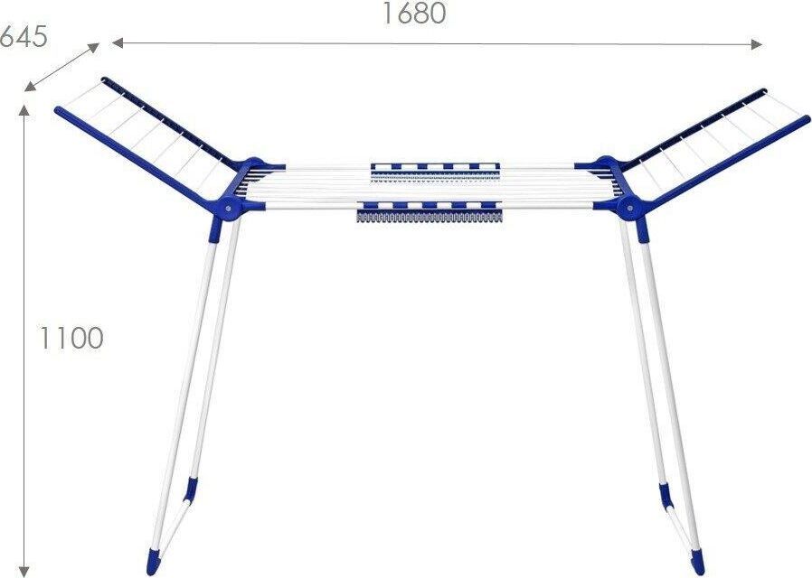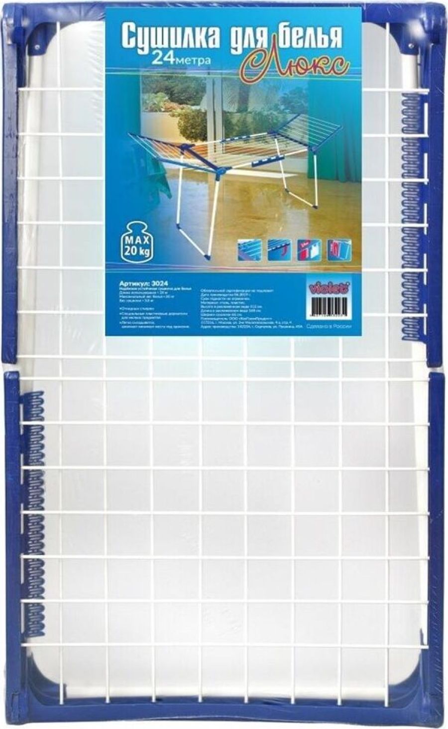 ЦВЕТ: белый. РАЗМЕР ИЗДЕЛИЯ: 645 x 1 680 x 1 100 мм. МАТЕРИАЛ: металл + полипропилен. Напольная сушилка «Люкс» - металлическая складная конструкция для размещения мокрого белья на горизонтальной поверхности. Оснащена двумя откидными створками и пластиковыми накладками с креплениями для сушки нижнего белья, носков, платков. Сушильное полотно имеет длину 24м и выдерживает нагрузку в 20кг. Ножки сушилки оснащены пластиковыми накладками для предотвращения скольжения сушилки по поверхности пола.