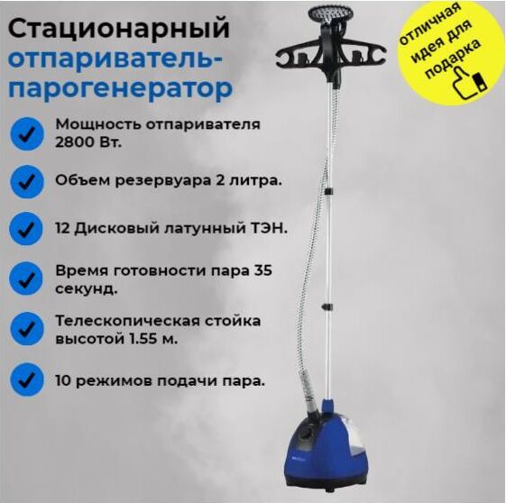 Отпариватель-парогенератор.Объем резервуара: 2л. Мощность: 2800Вт. Время нагрева: 35сек.10 режимов пара.12-ти дисковый латунный тэн. Готовность пара: 30сек. Телескопическая стойка: 1.40м. Длина шланга: 1.40м. Вешалка в комплекте Автоматическое выключение при температуре свыше допустимого уровня Длина кабеля: 135см.