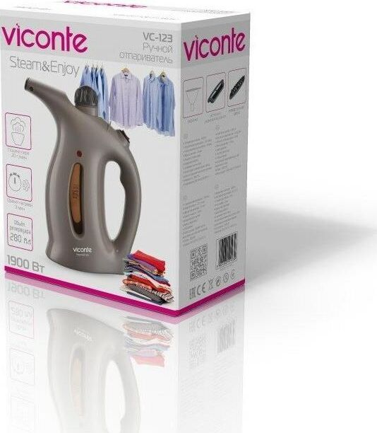 Ручной отпариватель Viconte VC-123 1900 W, Ручной отпариватель, мощность 1900 W, рабочий объем - 280 мл, непрерывная подача подача пара - 15 минут, постоянная подача пара - 20 г/мин, шкала уровня воды, кнопка вкл/выкл., защита от перегрева, 2 режима подачи пара. Аксессуары: универсальная щётка, щётка для удаления ворсинок, воронка.