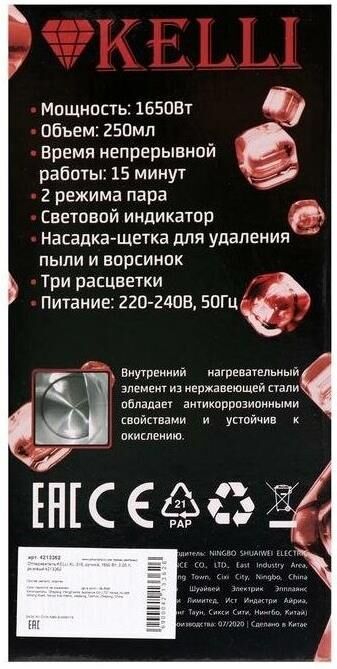 Ручной отпариватель-парогенератор. Мощность: 1650Вт; Объем: 250мл; Время непрерывной работы: 15мин; Насадки-щеётка для удаления пыли и ворсинок; 2 режима пара; Световой индикатор; Шкала-индикатор уровня воды; Внутренний нагревательный элемент из нержавеющей стали; Питание: 220-240В, 50ГЦ.
