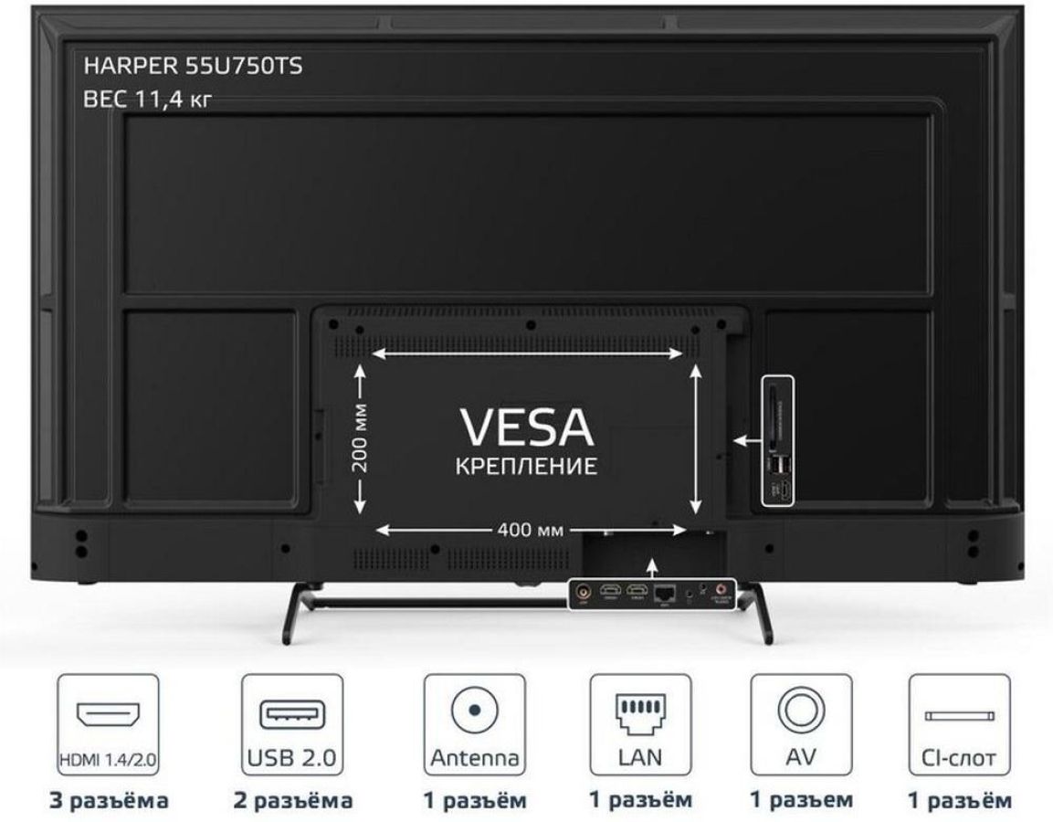 55" (139 см), 3840x2160 (ULTRA), Smart TV, USB медиаплеер с поддержкой MKV видео, цифровой тюнер DVB-T2/DVB-C/DVB-S2 (H.265/H.264/MPEG4/2/1/VC1/DivX), встроенный приемник спутниковых каналов и слот CI+ для модуля условного доступа, функция MHL, формат экрана: 16: 9, формат изображения: 16: 9; 4: 3, Авто, разрешение экрана: 4K 3840x2160, динамическая контрастность: 140000: 1, яркость: 300 кд/м2, угол обзора (Г/В): 178°/178°, время отклика: 8 мс, 1 миллиард цветов, воспроизводит формат HDTV Ultra HD/1080p/1080i/720p/576p/576i/480p/480i, 3D цифровой фильтр, русское, английское меню, телетекст, аудио: 2х8 Вт, операционная система Android 6.0 CPU Quad Core A9 1,2 GHz, GPU Dual Core MALI450MP2 400MHz, навигация по сети Интернет без использования персонального компьютера, встроенный контроллер беспроводного доступа Wi-Fi, разъемы для подключения: 2 USB, 3 HDMI