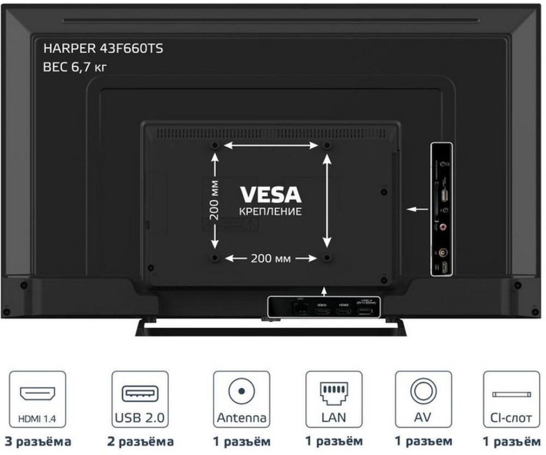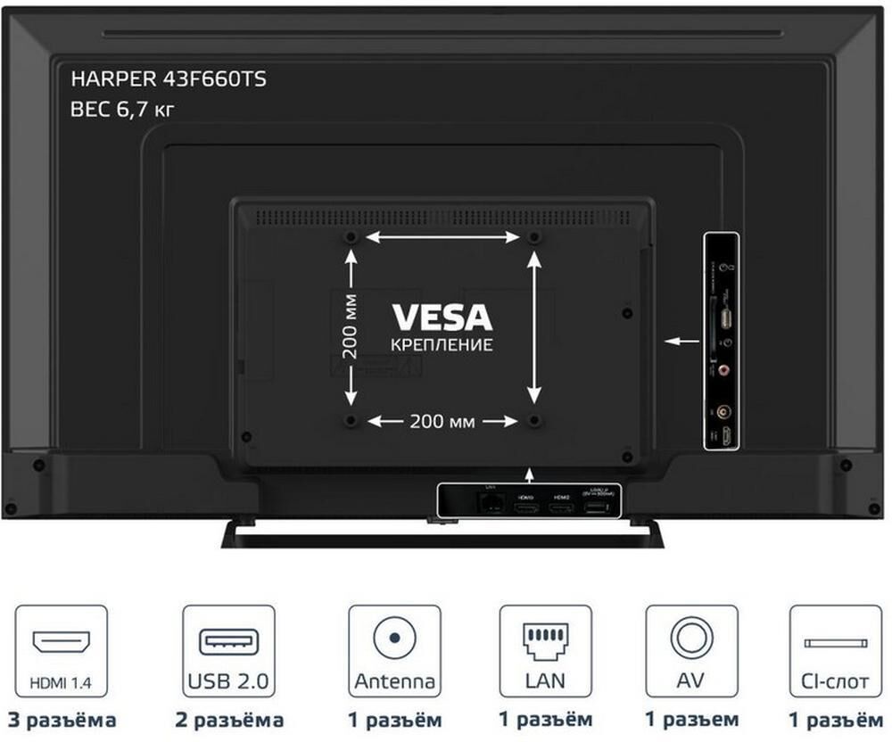 43" (109см),Metal Y Stand,FULL HD 1920x1080, SMART TV (Frameless AOSP 11 1RAM + 8Gb ROM, цифровой тюнер DVB-T2/DVB-C ,Запись ТВ программ , Электронный Телегид, Отложенный просмотр; слот CI+ для модуля условного доступа, формат экрана: 16: 9, Авто динамическая контрастность: 90000: 1 , яркость: 250 кд/м2, угол обзора (Г/В): 178°/178°, время отклика: 8 мс, Частота обновления экрана - 50Гц, 3D цифровой фильтр, русское, английское меню, телетекст, аудио: 2х10 Вт, операционная система Android 11 MSD6A338 Cortex А7 1,5 ГГц ST, Mali400*2 ( Оперативная память 1G, Внутреняя память 4G) входы: антенный ,разъемы для подключения: 2 USB, 3 HDMI, копмозитный AV, компонентный YPbPr, HDMI,ПК аудио,SCART вход,SPDIF, вход для наушников, вход CI+ (common interface), вход для антенны