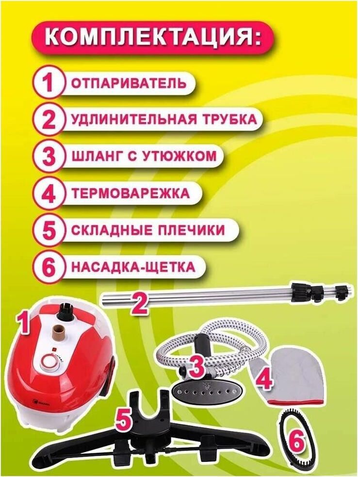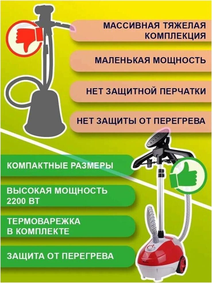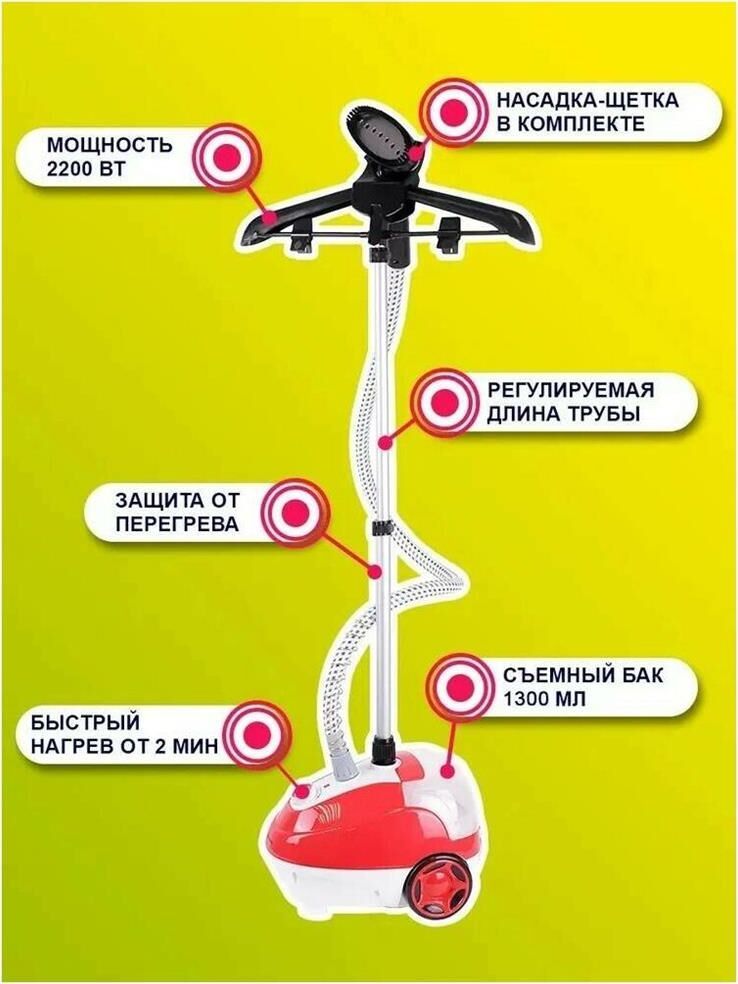 Отпариватель для одежды вертикальный. Имеет напольный тип установки. Прибор действует с мощностью 2200 Вт и для готовности требует ожидания в течение 2-5 минут. Имеется съемный бак для воды на 1.5 л и визуально понятная индикация работы. Система дополнена защитой от перегрева.Оборудование нагревается до 98 градусов и действует со скоростью потока пара 35 г/мин. Удобный паровой шланг обладает длиной 1.4 метра, что в совокупности с универсальной насадкой-щеткой способствует простому и удобному уходе за разными типами одежды. Прибор поставляется с вертикальной стойкой длиной до 1.2 метров и вешалкой.Размер коробки 38х28х32 см