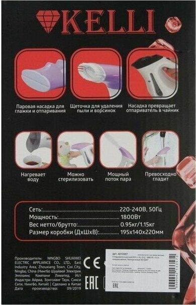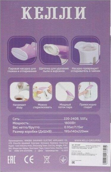 Паровая насадка. Насадка преобразующая отпариватель в чайник. Щеточка для удаления пыли и ворсинок. Кнопка вкл/выкл. Шкала уровня воды. Мерный стакан. Напряжение: 220-240 В Объём: 500 мл Мощность: 1800 Вт.