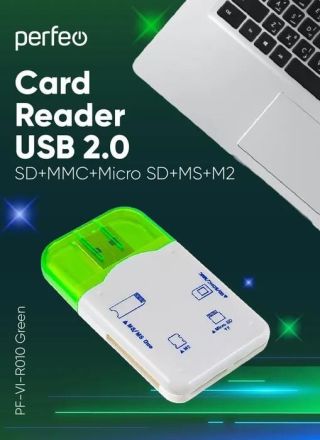 Картридер PERFEO (PF_4258) Card Reader SD/MMC+Micro SD+MS+M2, (PF-VI-R010 Green) зеленый